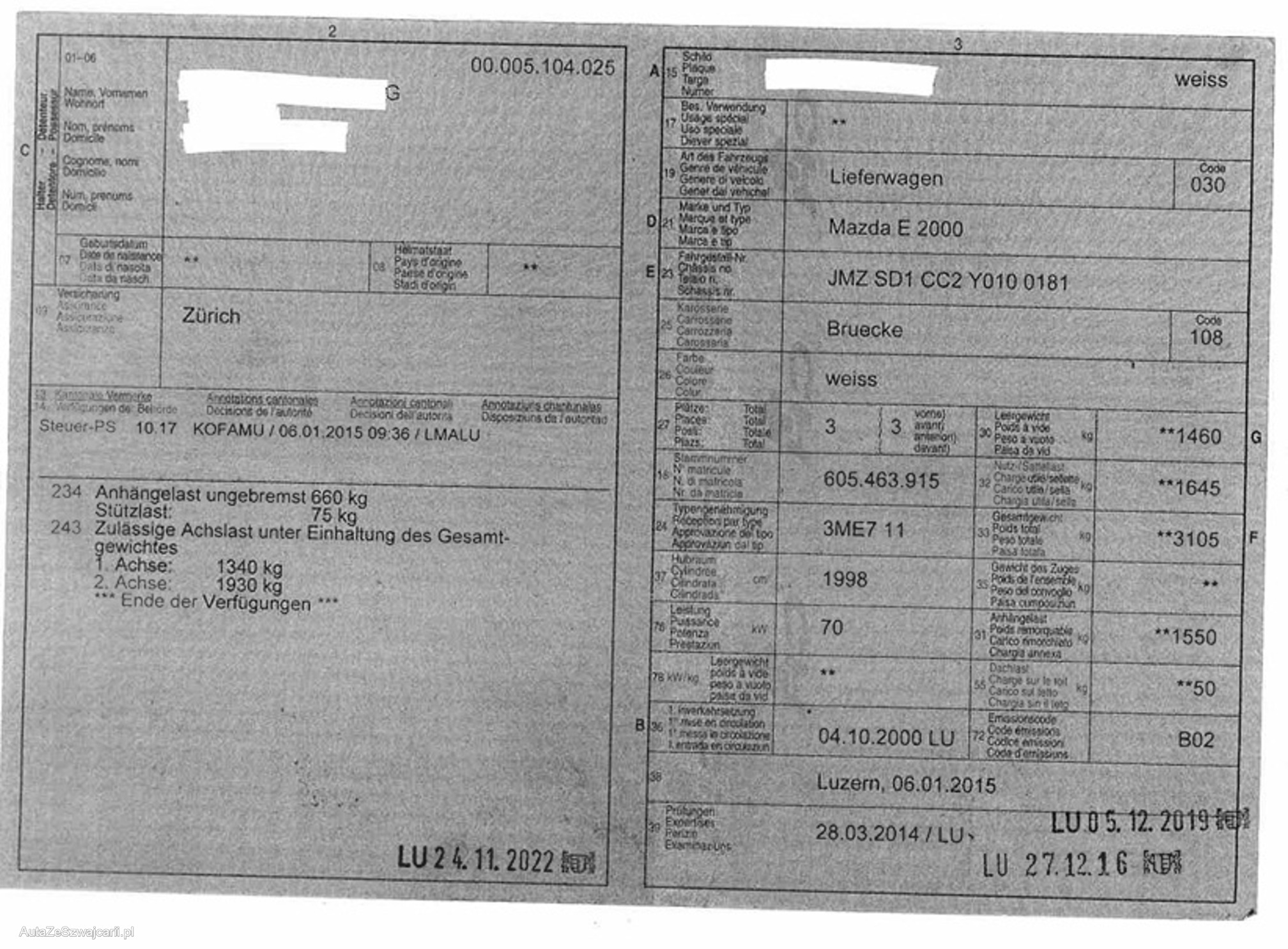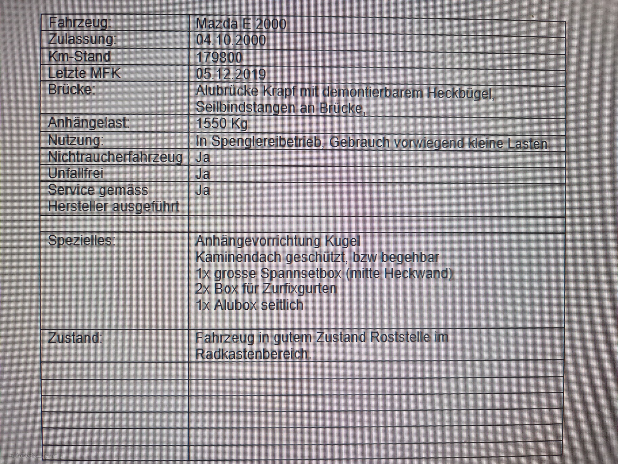 | Kommentar | Es wurde keine technische Prüfung vorgenommen. Beschreibungen siehe Bild im Anhang Fahrzeug ab Platz und ohne Garantie |