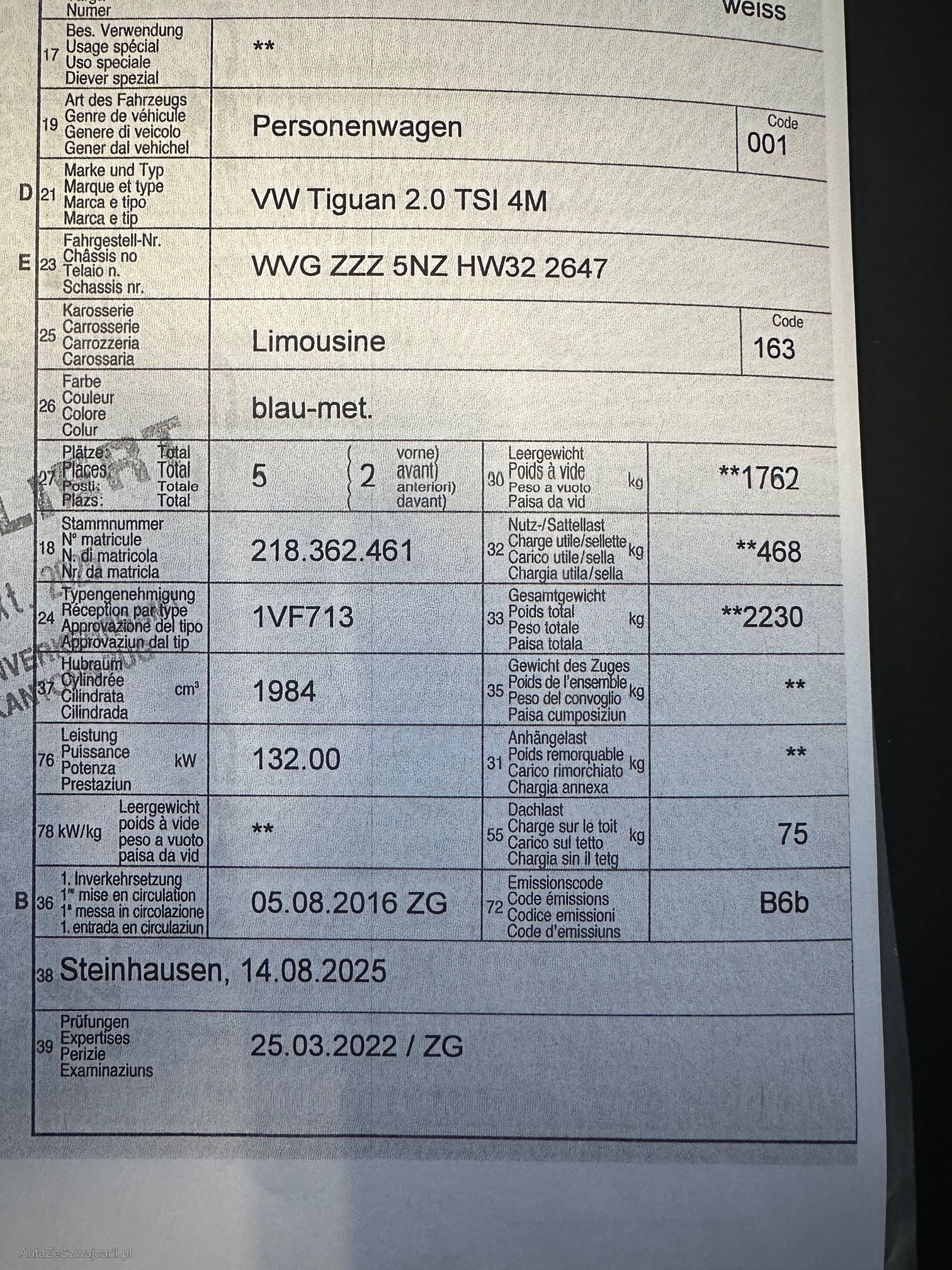 | Kommentar | Ölverlust Nockenwellenversteller Sitzwange VL rissig. Beule Kotflügel VR Bremsen hinten MFK |