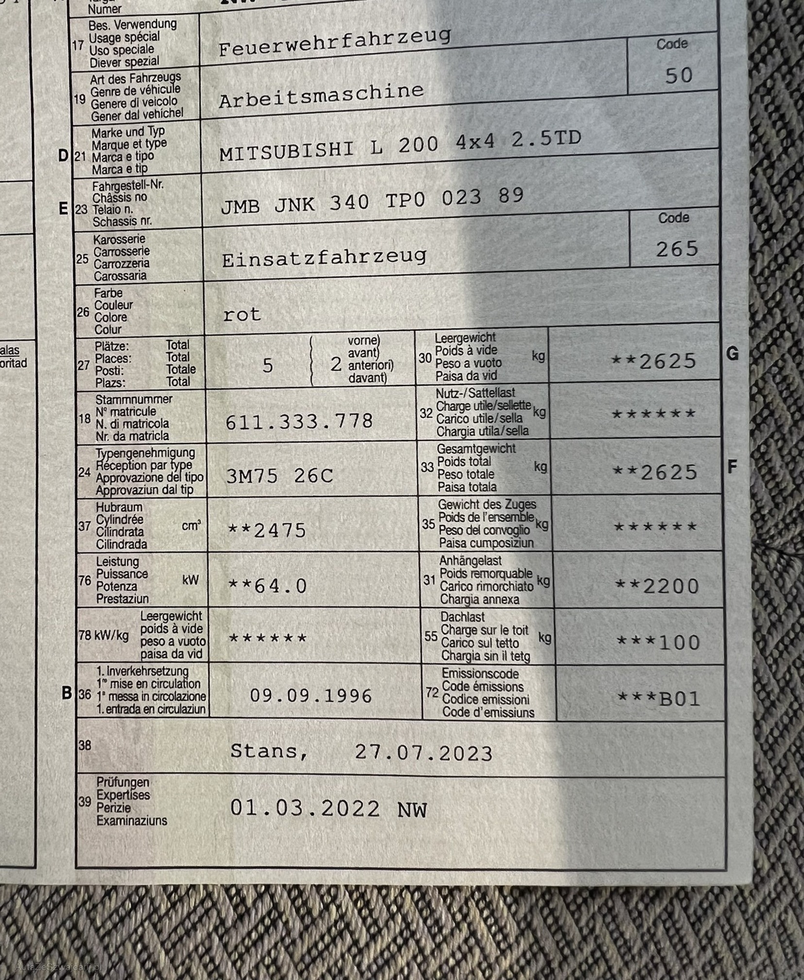 | Kommentar | Verfügbarkeit: das Auto ist noch ca. 1 - 2 Monate im Einsatz Folgende Mängel wurden festgestellt: - Dellen auf dem Dach - allgemeine Gebrauchsspuren an Karrosserie - Lenkgetriebe ölig - weiterer leichter Ölverlust siehe Fotos - Rost an Kotflügel / Schweller Beifahrerseite, siehe Fotos - Reifenwechsel fällig Es wurde kein vollumfänglicher Zustandstest gemacht, weitere Mängel sind nicht ausgeschlossen. Das Auto ist voll Funktionsfähig. Horn und Blaulicht wird vor Übergabe demontiert. Ab Platz, ohne Garantie |