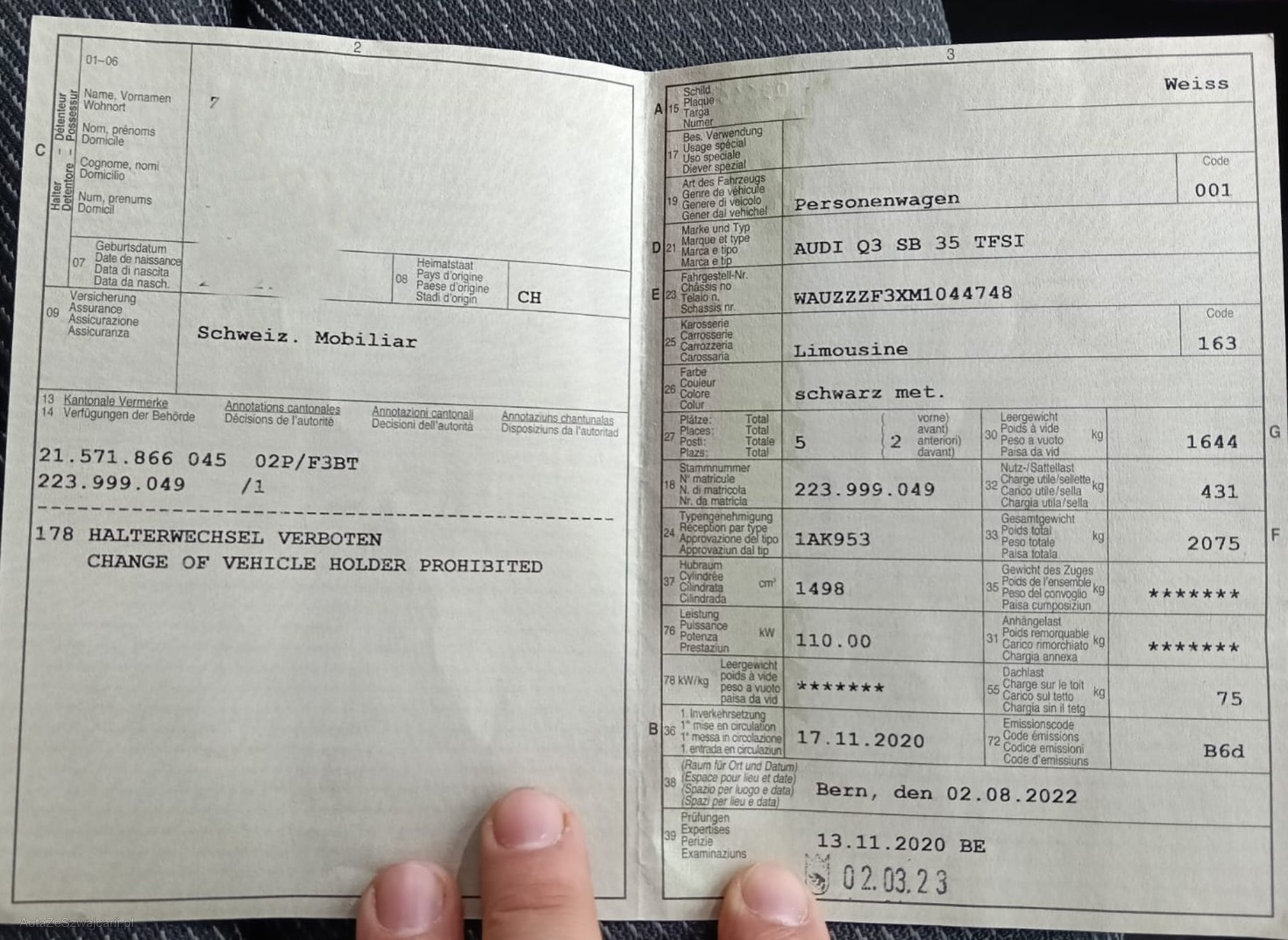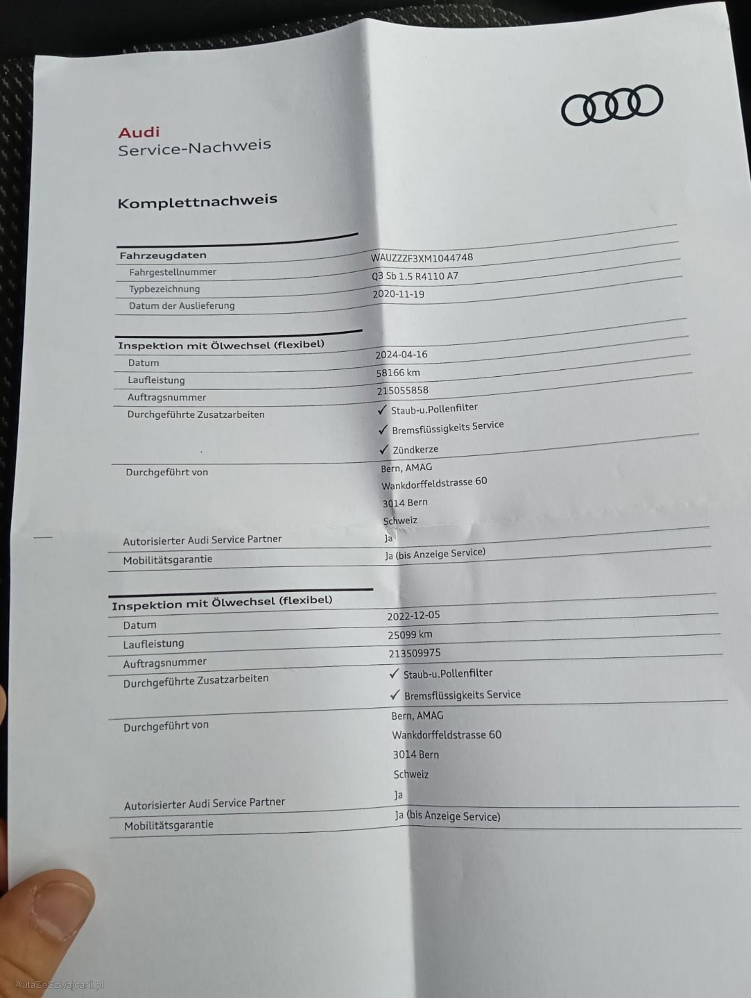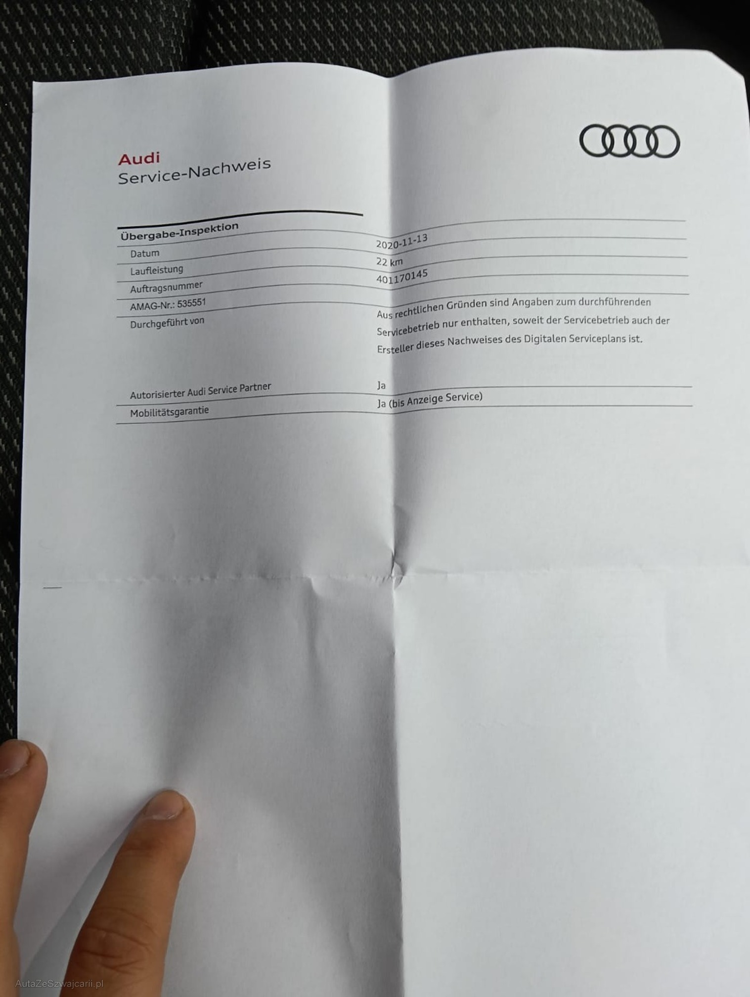 | Kommentar | - Fahrzeug hat ASSP bis 100 000km - 1 kleine Delle Türe HR - viele feine Kratzer Frontklappe Fahrzeugbereifung, Fahrzeugzustand und Ausstattung gemäss Bildern. Unsere Fahrzeuge wurden keiner Prüfung unterzogen, Fahrzeugkauf auf eigenes Risiko ab Platz ohne Nachwährschaft. Das Gewährleisten für Sachmängel wird weggegangen. |