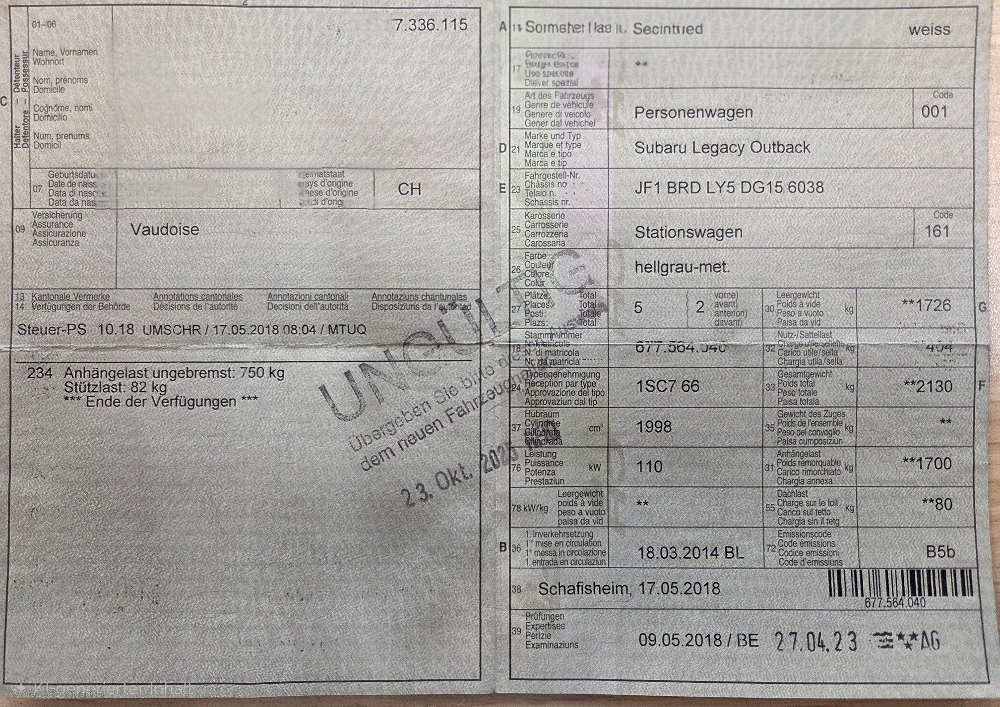 | Kommentar | letzter Service 04.2025, kleine Beule Heckdeckel, ansonsten Karrosserie und Innenraum gut, Fahrzeug gepflegt, evtl. auch Partikelfilter in Mitleidenschaft gezogen, sonst kein Werkstatttest ausgeführt Das Risiko liegt somit vollumfänglich beim Käufer. Um Missverständnisse zu vermeiden kann das Fahrzeug auf Voranmeldung besichtigt & getestet werden. Wird davon bewusst kein Gebrauch gemacht, liegt die Verantwortung beim Käufer. Nach Zuschlag, keine Nachverhandlungen möglich. Ab Platz ohne Garantie, Wandelung und Minderung werden wegbedungen. Abholung vom Fahrzeug spätestens 10 Tage nach dem Zuschlag. Spätere Abholungen können abgemacht werden, werden jedoch mit Fr. 8.- / Tag in Rechnung gestellt. |
