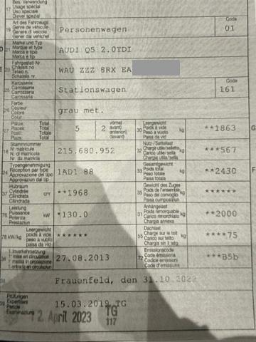 | Condition_and_Equipment | Zustand Fahrzeug muss transportiert werden (Höhe und Breite beachten). Fahrzeug ist rollbar. Bereifung Fahrzeug wird mit Winterräder abgegeben. --- Links Linke Seite beschädigt. Anstoss links im Bereich der A-Säule. Achse Risiko Vorderachse. Risiko Lenkung. --- Serienaustattung Sitzheizung für Vordersitze Lederlenkrad 4-Speichen Tempostat Aussenspiegel elektrisch verstellbar und heizbar Nebelscheinwerfer Radio Chorus Airbag Fahrer und Beifahrerseite Seitenairbag Fahrer und Beifahrerseite ESP/ ASR/ EDS/ ABS mit EBV Seitliches Kopfairbagsystem SIDEGUARD Elektrische Fensterheber vorne + hinten Reserve-Notrad Tagesfahrlichtschaltung Aussenspiegel in Wagenfarbe Zierleisten Seitenfenster mit Alueinfassung glänzend Servolenkung Bremsassistent EBA Netztrennwand Dieselpartikelfilter DPF Kindersitz-Vorbereitung Isofix hinten Normalsitze vorne Leichtmetallräder 17" 6-Arm Design 235/65 Keine Gewähr auf die Angaben der Serienausstattungen Komfort Klimaautomatik Dynamikfahrwerk Dekoreinlagen in Monometallic Sonderausstattung Lendenwirbelstützen elektr. für Vordersitze Dekoreinlagen in Aluminium Metallic-/ Perleffekt-Lackierung Scheinwerfer Reinigungsanlage Radio/ CD Concert und Lautsprecher Anhängevorrichtung schwenkbar Ablagepaket Lichtpaket Automatisch abblendbarer Innenspiegel Park-System plus vorne + hinten Manuelles Sonnenschutzrollo für Seitenscheiben hinten Licht- und Regensensor Audi Sound System Klimaautomat plus 3-Zonen Pack Design Sport Alcantara Rücksitzbank plus Bluetooth Schnittstelle Leichtmetallräder 19" 5-Arm-Stern |