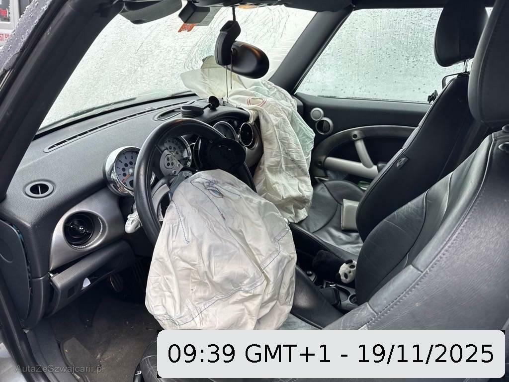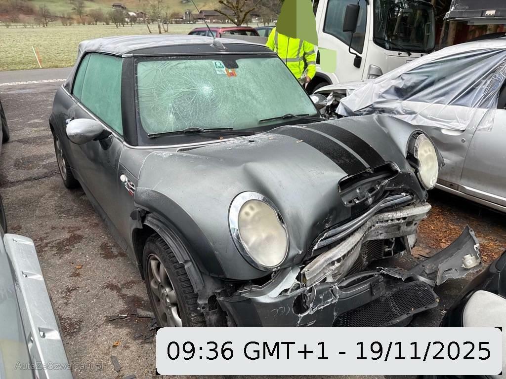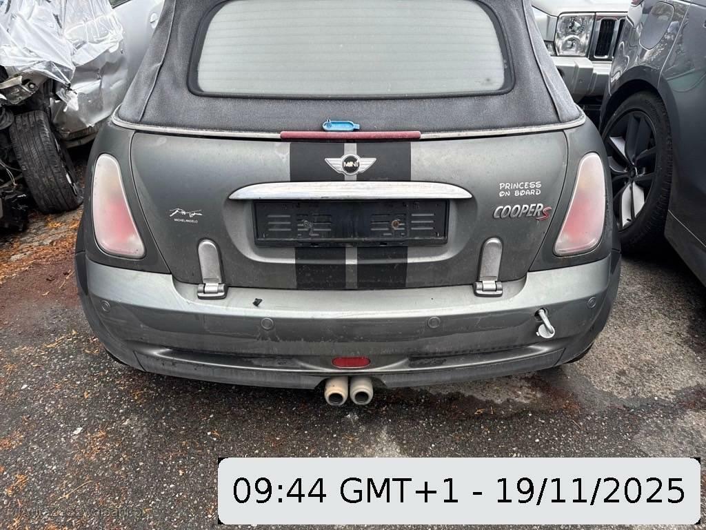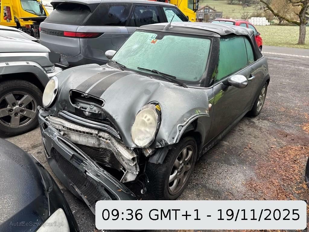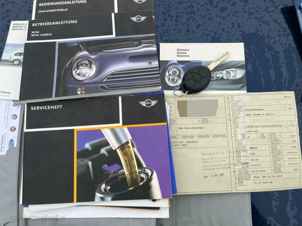 | Serienausstattung | Türgriffe aussen verchromt, Überrollschutzsystem, Radio Wave, Seitenschwellerverbreiterung in schwarz, Stossstangen und Aussenspiegel in Wagenfarbe, Ablagefach, Automatische Stabilitäts- und Traktions- kontrolle, Fahrersitz höhenverstellbar, Gurtstraffer vorne, Airbag: Airbag Fahrer und Beifahrer, Sportfahrwerk, Drehzahlmesser, Stabilisatoren vorne und hinten, Lenkrad höhenverstellbar, Bremsassistent (BAS), Wassertemperaturanzeige, Leuchtweitenregulierung elektrisch, Lenkrad: Servolenkung, Reifendruckverlust-Warnsystem, Vollautomatisches Verdeck, Lackierung: Uni-Lackierung, Mittelkonsole, Licht: Abblendlichtausschaltverzögerung 'Follow me home', Getriebe: 6-Gang-Getriebe, Heckscheiben-Wisch-/Waschanlage mit, Applikationen Alloy Patina, Wegfahrsperre elektronisch, Reifenreparatur-Set mit Kompressor, Drittes Bremslicht, 4 Leichtmetallfelgen 16J mit Pneu, Einstiegsschienen, Cornering Brake Control (CBC), Zweiklanghorn, Seitenairbags, Nichtraucherausführung, Polster: Stoff-Ausstattung, Sitze: Sportsitze vorne, Türgriffe innen verchromt, Aussenspiegel rechts und links elektrisch verstellbar, Antiblockiersystem (ABS), Lichtwarnsummer, Pollenfilter (Staubfilter), Katalysator geregelt, Wartungsintervall-Anzeige, Bremsbelag-Verschleissanzeige, Höhenverstellbare Gurten vorne, Elektrische Fensterheber vorne + hinten, Tageskilometerzähler, Digital Uhr, Kopfstützen hinten, Park Distance Control (PDC), Abschliessbares Handschuhfach, Sitze: Rücksitzlehne geteilt abklappbar, Zentralverriegelung mit Fernbedienung, Lederlenkrad Cooper S, Schalthebelknauf aus Chrom, Getönte Scheiben, Heckscheibenheizung, Licht: Nebelschlussleuchte, Scheibenwischer vorne mit Intervall, Cupholder vorne und hinten |