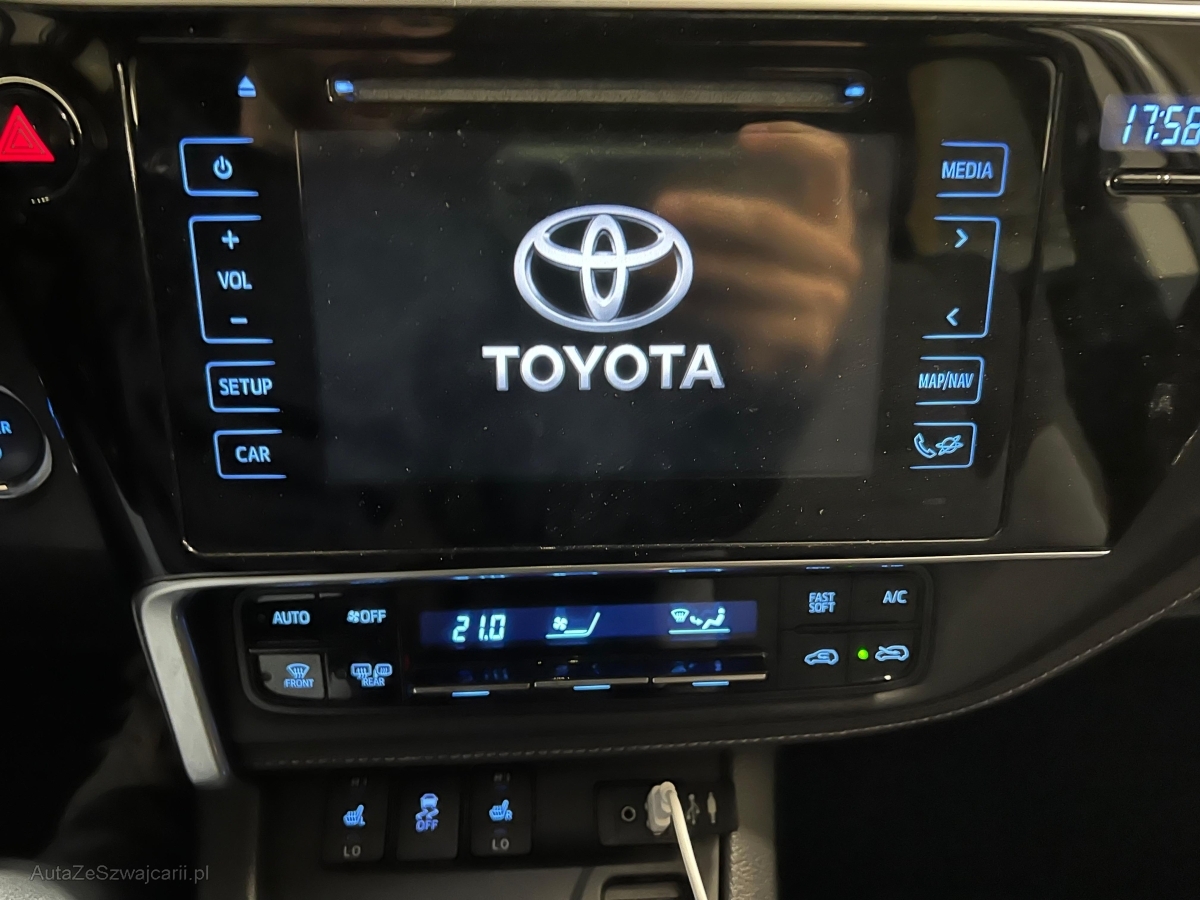 | Serienausstattung | Aussenspiegel rechts und links beheizbar und elektrisch verstellbar, Klima: Klimatisierungsautomatik, Aussenspiegel und Türgriffe in Wagenfarbe, Digital Uhr, 12-Volt-Steckdose hinten, Media: Multimedia Audiosystem Toyota Touch 2, Elektrische Fensterheber vorne + hinten, Heckscheibenheizung, Halogenhaupt- und Fernscheinwerfer in Klarglasoptik, Lenkrad: Multifunktionslenkrad, 3-Punkt-Sicherheitsgurte auf allen Plätzen, Wegfahrsperre elektronisch, Media: 6 Lautsprecher, Sitze: Beifahrersitz höhenverstellbar, Make up-Spiegel links, Licht: LED-Tagfahrlicht, Dämmerungssensor, Sitze: Vordersitze heizbar, UV-absorbierende Verglasung, Smart Entry-/Start-System, Lederhandbremshebel, Seitenfenster-Zierleisten verchromt, Stabilitäts- und Traktionskontrolle (VSC und TRC), Licht: Nebelschlussleuchte, Assist: Spurhalteassistent, Fernlichtassistent, Verkehrsschilderkennung, Airbag: Knie-Airbag für Fahrer, Mittelarmlehne hinten, Airbag: Airbag Fahrer und Beifahrer, Lenkrad: Lenkrad längs- und höhenverstellbar, LED Blinker im Aussenspiegel, Kartentaschen an den Rückenlehnen, Media: Bluetooth-Schnittstelle, Laderaumabdeckung, Pollenfilter (Staubfilter), Katalysator geregelt, Media: USB+AUX-Anschluss, Licht: Drittes Bremslicht, Lenkrad: Lenkrad, Schaltknauf und Handbremshebel Leder, Bremsassistent (BAS), Assist: Tempomat, Gepäcktrennnetz, Türwarnsummer, Räder: TPMS Reifendrucküberwachungssystem, Zentralverriegelung mit Fernbedienung, Ablagen in den Türen, 12 Volt-Steckdose im Laderaum, Assist: Rückfahrkamera, Assist: Verkehrszeichenerkennung RSI Road Sign Information System, Polster: Stoff-Ausstattung, Getriebe: Stufenloser Automat, Gurtstraffer mit Gurtkraftbegrenzer vorne, Regensensor für Scheibenwischer vorne, Räder: Reifenreparatur-Set (Tire Fit), Licht: LED Heckleuchten, Getönte Scheiben, Spurwechselwarnung, Automatisches Fernlicht, Make up-Spiegel rechts, Kindersicherung an den hinteren Türen, Assist: Kollisionswarnung, 12-Volt-Steckdose vorne, Kopfstützen vorne höhenverstellbar, Innenspiegel automatisch abblendbar, Räder: 4 Leichtmetallfelgen 16J mit Pneu, Wärmeschutzverglasung, Scheibenwischer vorne mit Intervall, Sitze: Fahrersitz höhenverstellbar, Servolenkung, Mittelarmlehne vorne, ABS, EBD elektronische Bremskraftverteilung, Cupholder vorne und hinten, Start-/Stop-Automatik, Sitze: Rücksitzlehne geteilt abklappbar, Airbag: Airbag Beifahrer deaktivierbar, Aussenspiegel elektrisch einklappbar, Media: Digitaler Radioempfang (DAB/DAB+), Assist: Berganfahrhilfe (Hill Assist Control - HAC), ISOFIX Kindersitzvorrichtung, Drehzahlmesser, Fahrer-Informationssystem mit Farbdisplay, Heckscheiben-Wisch-/Waschanlage, Tankdeckel-Entriegelung von innen, Gurtkontrolle, Kreuzstütze für Fahrersitz verstellbar, Airbag: Window-Kopfairbags, Seitenaufprall-Schutzsystem, Licht: Nebelscheinwerfer, Lackierung: Uni-Lackierung, Start-/Stop-Knopf, Gepäckraumboden aufstellbar, Radiofernbedienung, Sitze mit Schleudertrauma-Schutzsystem, Licht: Abblendlichtausschaltverzögerung 'Follow me home', Kopfstützen hinten höhenverstellbar, Airbag: Seitenairbag für Fahrer und Beifahrer, Dachreling silber |
