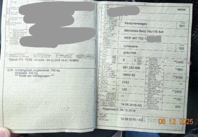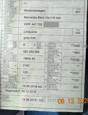 | Condition_and_Equipment | Zustand Fahrzeug ist rollbar. Bereifung Fahrzeug wird mit Winterräder abgegeben. Schlüssel Nur ein Schlüssel vorhanden. --- Front Fussgängerschutz ausgelöst. Front eingedrückt. Motorhaube eingedrückt. Frontblech/Maskenblech eingedrückt. Längsträger vorne links gestaucht. Fahrzeugvorbau verschoben. Motor Alle Kühler vorne sind eingedrückt. Elektrik Risiko Steuergeräte. --- Serienaustattung Klimaanlage Airbag Fahrer und Beifahrerseite Elektrische Fensterheber vorne Aussenspiegel elektrisch verstellbar und beheizbar ABS Antiblockiersystem Servolenkung Schiebetüre links Schiebetüre rechts Elektronische Wegfahrsperre Zentralverriegelung mit Fernbedienung ESP Elektronisches Stabilitätsprogramm 12V Steckdose Antriebsschlupfregelung ASR Tagesfahrtlichtschaltung Seitenfenster hinten Stärkere Batterie Fenster links im Lade-/ Fahrgastraum Fenster rechts im Lade-/ Fahrgastraum Fenster in Heckklappe mit Wisch-Waschanlage Bremsassistent BAS Dieselpartikelfilter Elektronische Bremskraftverteilung EBV Fahrersitz verstellbar/ manuell Beifahrersitz verstellbar/ manuell Berganfahrassistent Reifendruckkontrolle Haltegriff für Einstieg Schiebetüre Innenspiegel Komfort-Fahrersitz Komfort-Beifahrersitz Thoraxbag für Fahrer Thoraxbag für Fahrer und Beifahrer Windowbag für Fahrer und Beifahrer Bluetooth Freisprecheinrichtung Fahrlichtautomatik Zusatzheizer USB Anschluss Anhänger-Steckdose Stop + Start System Blue EFFICIENCY 3er Sitzbank Komfort/ 1. Reihe 3er Sitzbank Komfort/ 2. Reihe Keine Gewähr auf die Angaben der Serienausstattungen Stahlfelgen 16" Radio Audio 10 Komfortöffnung und Schliessung mit Fernbedienung Kunststoffboden im Fahrgastraum Sonderausstattung Metallic-Lackierung Allradantrieb Navigationssystem Lederlenkrad Rückfahrkamera Anhängerkupplung abnehmbar Klimaautomat im Fond Multifunktionslenkrad/ Bordcomputer Staufach in Mittelkonsole Stossfänger in Wagenfarbe Parklenkassistent Dunkelgetönte Verglasung (hinten) Stahlfelgen 17" Pack Park Sitzschienensystem |