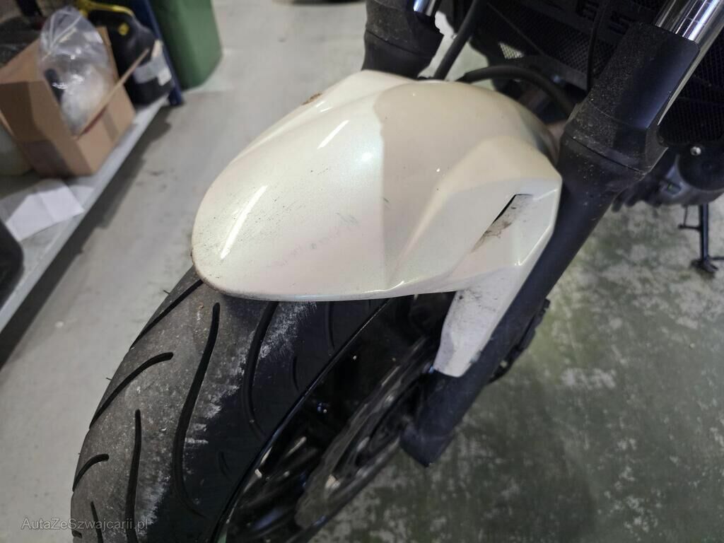 Choc latéral gauche : fourreau de fourche, clignoteur avant, levier d'embrayage, rétroviseur, commodo, poignée, guidon, écope, réservoir à carburant et cache inférieur, radiateur et déflecteur latéral, protecteur de chute, carter alternateur, béquille latérale, sélecteur vitesses, repose-pied conducteur, repose-pied passager et platine, supports béquille d'atelier, axe de roue arrière, carénage de selle.