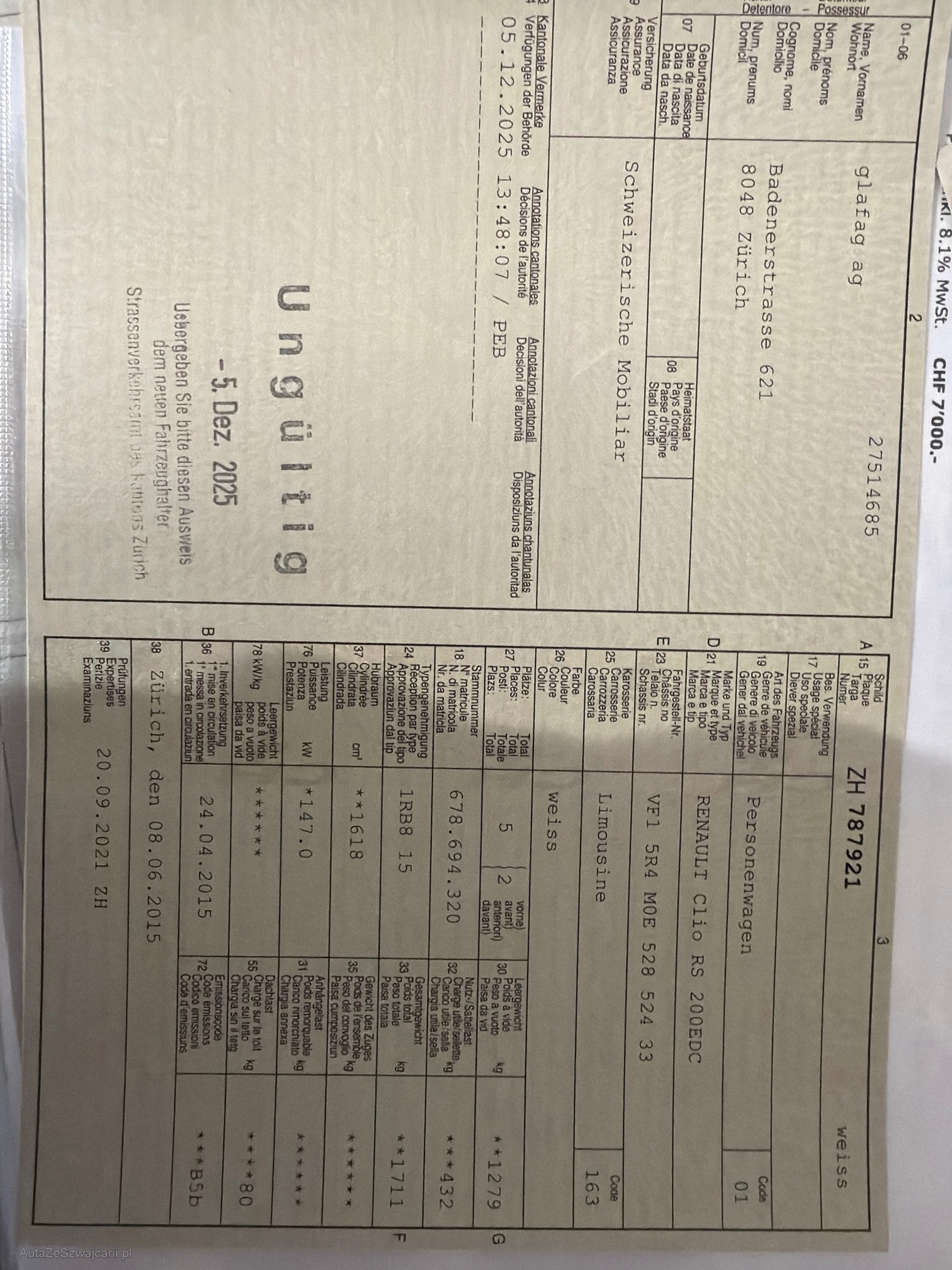 | Kommentar | Technisch in super Zustand Ab Platz ohne Garantie und Gewährleistung! Fahrzeug muss innert 5 Tagen abgeholt werden! |