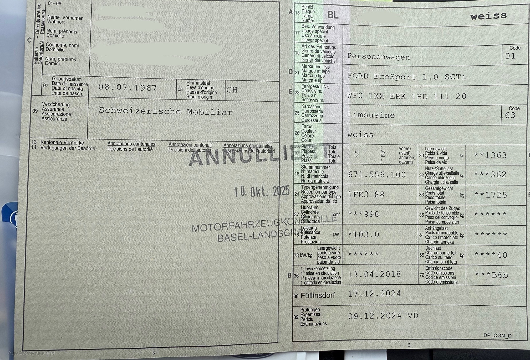 | Kommentar | Dem Fahrzeug wurde kein Werkstatttest unterzogen. Eine vollständige Überprüfung sämtlicher Funktionen wurde nicht durchgeführt. Für sichtbare sowie für nicht sichtbare Mängel wird keinerlei Haftung übernommen. Der Verkauf erfolgt ab Platz, ohne Garantie und ohne Gewährleistung. Sämtliche Ansprüche auf Wandelung oder Minderung werden ausdrücklich ausgeschlossen. Nach Zuschlag beziehungsweise nach Abschluss des Kaufvertrags sind Nachverhandlungen ausgeschlossen, auch bei nachträglich festgestellten und nicht deklarierten Mängeln. Das gesamte Risiko trägt der Käufer. Sämtliche an der Carrosserie festgestellten Schäden wurden, soweit ersichtlich, fotografisch dokumentiert. Dennoch können weitere, nicht erkannte oder nicht dokumentierte Mängel an der Carrosserie nicht ausgeschlossen werden. Dellen, Kratzer, Beulen sowie Gebrauchsspuren sind ausdrücklich nicht ausgeschlossen. Ebenso können Nachlackierungen vorhanden sein. Das Fahrzeug wurde gründlich gereinigt. Dennoch kann nicht ausgeschlossen werden, dass sich vereinzelt noch Hundehaare im Innenraum befinden. Zudem ist ein Geruch nach Hund wahrnehmbar, welcher je nach Empfinden als stärker ausgeprägt empfunden werden kann. Nach der Fahrzeugwäsche wiesen beide Scheinwerfer leichte Feuchtigkeit auf. Der linke Scheinwerfer weist zudem Kratzer auf. Es wird auf die entsprechenden Detailfotos verwiesen. Vor Abgabe eines Gebots kann das Fahrzeug nach vorgängiger telefonischer Terminvereinbarung besichtigt werden. Nach dem Zuschlag sind Nachverhandlungen nicht zulässig. Das Fahrzeug ist innert zwei Tagen nach Zuschlag abzuholen und bar zu bezahlen. Erfolgt die Abholung nicht fristgerecht, werden Standgebühren in der Höhe von CHF 50.– pro Tag erhoben. |