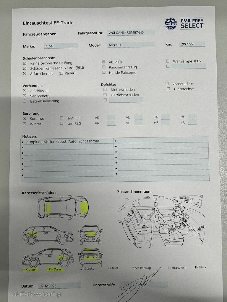 | Information | -Kupplungssteller kaputt, Auto nicht fahrbar -8-fach bereift -2 Schlüssel, einer etwas kaputt aber geht noch |