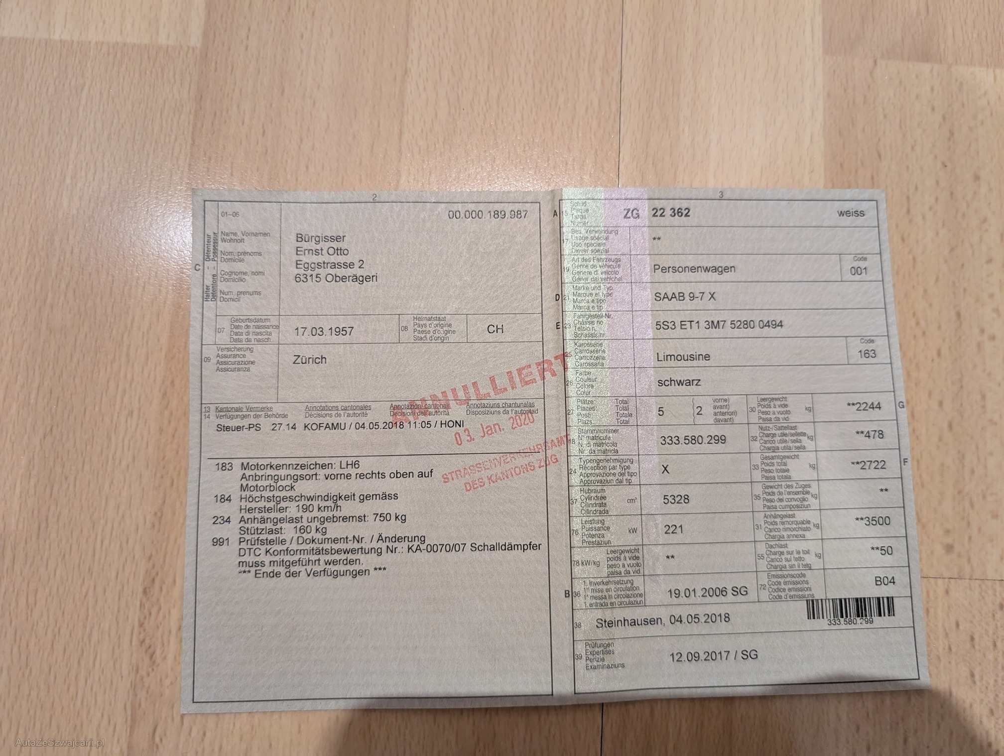 | Kommentar | Ab Platz ohne Garantie Div. Gebrauchtspuren 2 Fahrzeugschlüssel vorhanden Bekannte Mängel: -12V Batterie -Geräusch Vorderachse -Auspuff undicht -diverse Rostlöcher am Leiterrahmen -Sommerreifen sind alt -Bremsen vorne und hinten Rostig Das Fahrzeug wurde im Jan. 2020 ausgelöst und wurde anschliessend in einer Halle eingestellt. Abholung Industriestrasse 3, 6345 Neuheim |