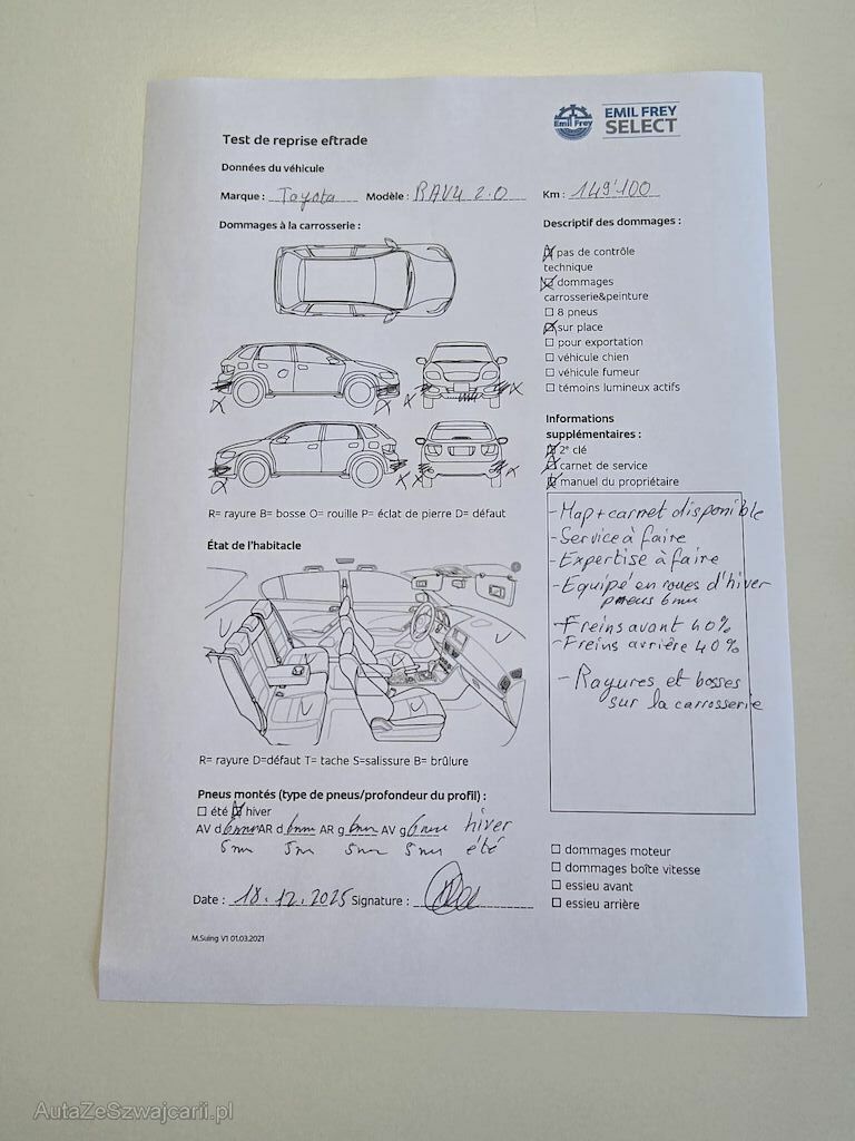 | Information | 2 clés Map + carnet de service disponible Service à faire Expertise à faire Equipé en roues d'hiver pneus 6 mm Freins avant 60 % Freins arrière 60 % Rayures et bosses sur la carrosserie Pas de contrôle technique (essai en route) effectué |