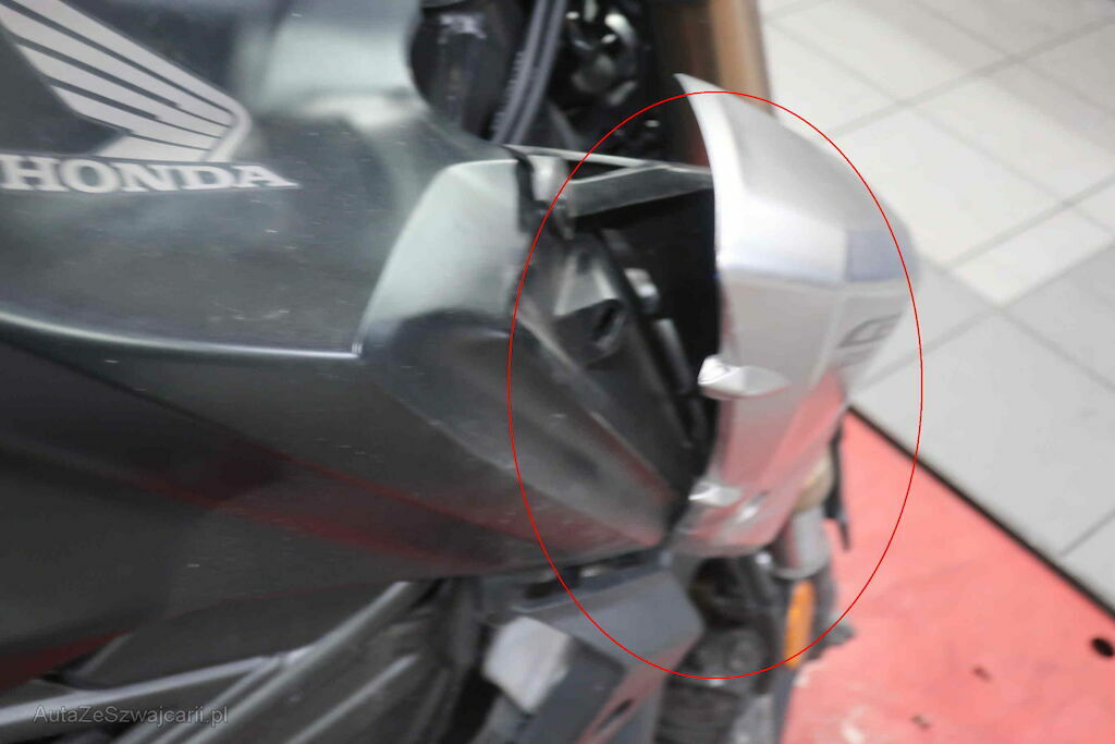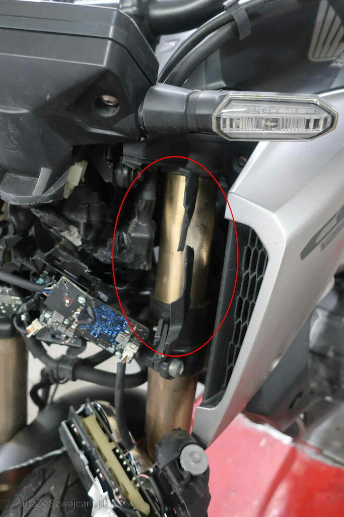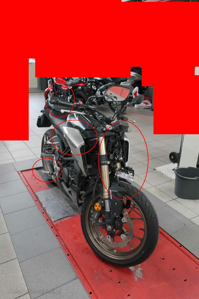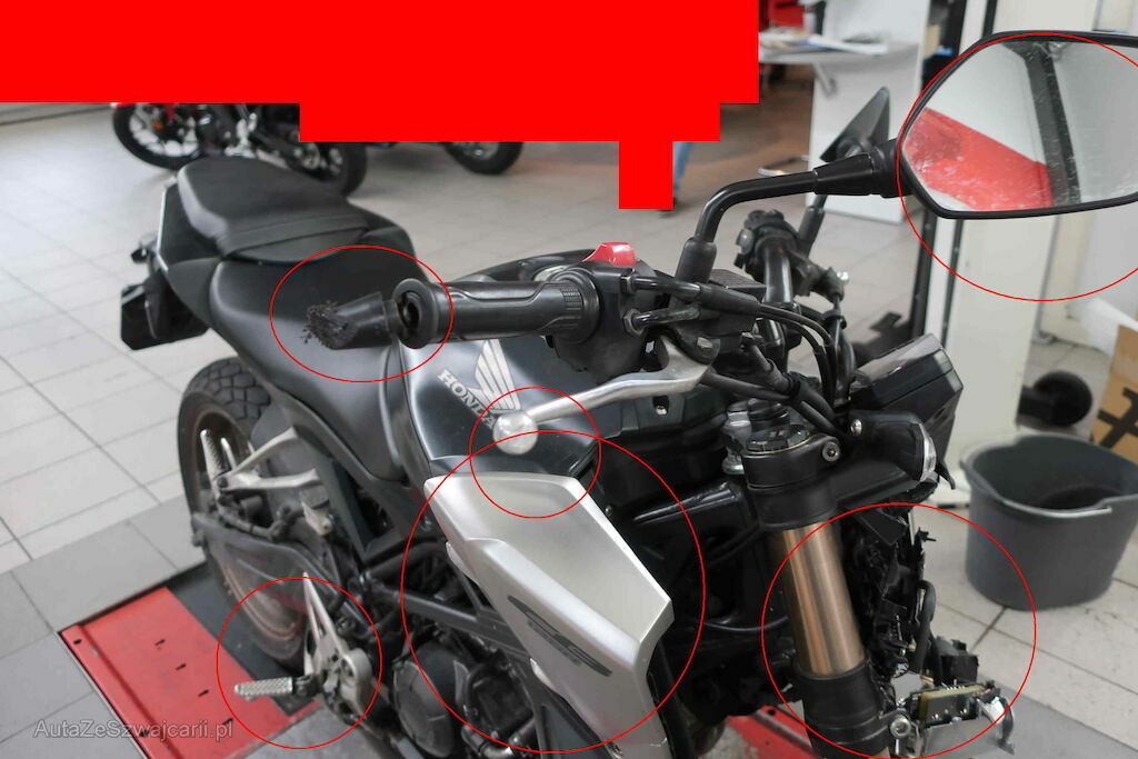 massiver Anprall Front und seitlich rechts: Scheinwerfer, Blinker rechts, Rad vorne, Bremspedal, Fussraster vorne und hinten, Gabel links und rechts, Lenkergewicht rechts, Fender vorne, Abdeckung Kraftstofftank etc.