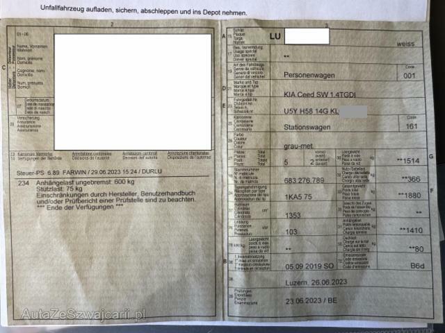 | Condition_and_Equipment | Demontage Persönliche Gegenstände oder Ladegut im Fahrzeug werden entfernt. Zustand Fahrzeug muss transportiert werden (Höhe und Breite beachten). Fahrzeug ist rollbar. Bereifung Fahrzeug wird mit Winterräder abgegeben. Zweiter Radsatz vorhanden Schlüssel Beide Schlüssel vorhanden. --- Front Front eingedrückt. Front rechts eingedrückt. Kotflügel vorne rechts eingedrückt. Motorhaube eingedrückt. Frontblech/Maskenblech eingedrückt. Radhaus vorne rechts eingedrückt / gestaucht. Fahrzeugvorbau verschoben. Heck Heck eingedrückt. Heck rechts eingedrückt. Seitenwand hinten rechts eingedrückt/aufgestaucht. Heckblech eingedrückt. Kofferboden eingedrückt. Heckklappe eingedrückt. Längsträger hinten rechts gestaucht / abgeknickt. Abgasanlage deformiert. Motor Alle Kühler vorne sind eingedrückt. Elektrik Risiko Steuergeräte. Kabelstränge verbrannt, beschädigt, abgerissen. Innenraum Gurtstraffer ausgelöst. Sitz vorne links defekt. --- Serienaustattung Airbag Fahrer und Beifahrerseite Sitzheizung vorne Elektrische Fensterheber Aussenspiegel elektrisch verstellbar und heizbar Tempomat Bordcomputer Servolenkung Zentralverriegelung mit Fernbedienung Kopfairbag vorne und hinten Regensensor Lederlenkrad mit Lederschaltknauf Gepäckraumabdeckung Leichtmetallfelgen 16" Deaktivierung Beifahrerairbag ESP/ TCS Zwei Zonen-Klimaautomatik Park-Distanz-Sensor hinten Mittelarmlehne vorne mit Staufach Seitenairbags vorne Automatisch abblendbarer Innenspiegel Isofix-Kindersitzbefestigung hinten ABS und EBD Elektr. Bremskraftverteilung HSA Berganfahrassistent Bluetooth und Sprachsteuerung Sitzbezüge in Stoff/ Leder JBL HiFi System Fahrersitz höhenverstellbar Fernlichtassistent Beifahrersitz höhenverstellbar Anschluss USB und AUX Reifendruck-Sensoren TPMS Lenkradheizung LED Tagfahrlicht Smart-Key Aussenspiegel elektr. einklappbar/ integrierte Blinker Totwinkel-Assistent Privacy-Verglasung Umklappbare Sitzlehne hinten asymmetrisch 60/40 Start + Stopp Automatik Nebelscheinwerfer mit Abbiegelicht Keine Gewähr auf die Angaben der Serienausstattungen Aktiver Spurhalteassistent LKAS Tempolimitanzeige Notbrems-Assistent Drive-Mode Navigationssystem/ Rückfahrkamera/ DAB+ Wireless Charging für mobile Geräte Apple Car Play/ Android Auto Garantie 7 Jahre/ 150'000 km Rückfahr-Querverkehrswarner Müdigkeitserkennung Ottopartikelfilter Sonderausstattung Metallic-/ Pearl-Lackierung Anhängerkupplung abschliessbar und abnehmbar Elektrosatz für Anhängevorrichtung 13-polig Pack Style Ausstattung Metallic-Lackierung |