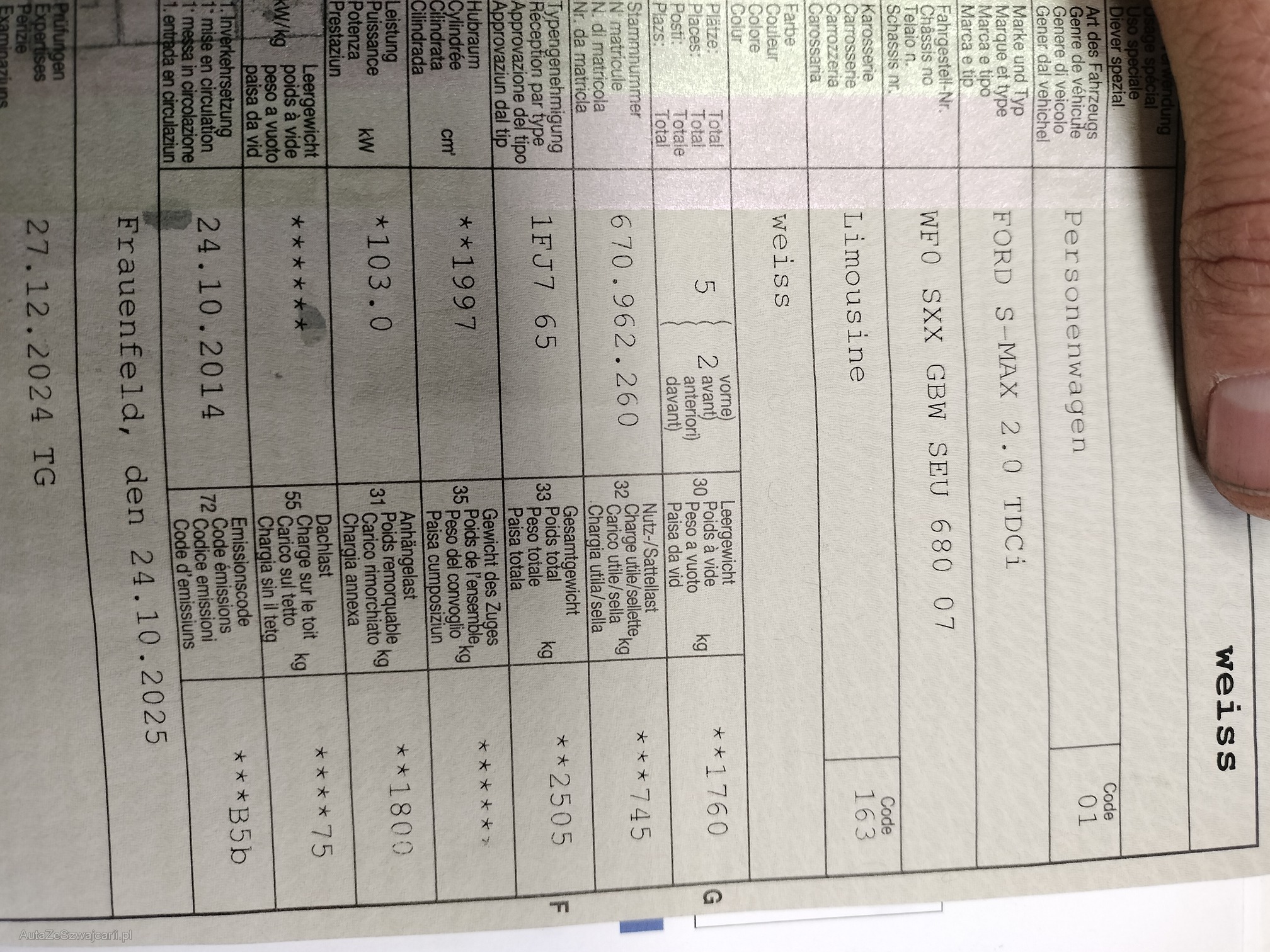 | Kommentar | Ford S-Max mit normalen Gebrauchsspuren. Winterreifen und Bemsen gut. Gemäss Kundenaussage kommt sporadisch Getriebefehlermeldung. Auf einer Probefahrt wurde aber nichts bemerkt. Bei Fragen anrufen. Verkauf Ohne Garantie und Rückgaberecht. |