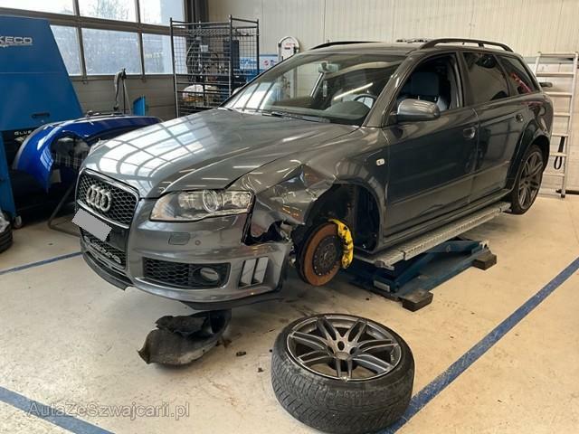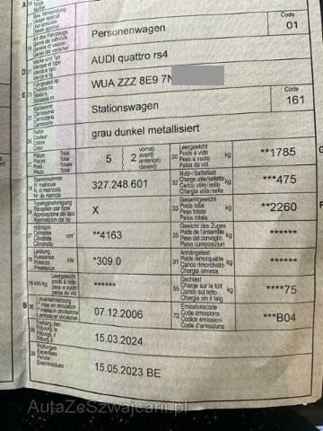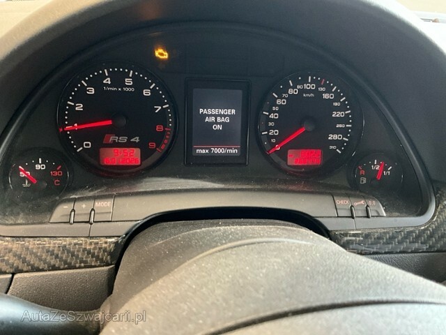 | Condition_and_Equipment | Zustand Fahrzeug muss transportiert werden (Höhe und Breite beachten). --- Links Linke Seite beschädigt. Anstoss links im Bereich der A-Säule. Front Radhaus vorne links eingedrückt / gestaucht. Heck Abgasanlage deformiert. Motor Risiko Motor. Öl-/Kraftstoffaustritt vorhanden Achse Vorderachse ist beschädigt. Aufhängungsteile vorne links beschädigt. Lenkgetriebe ist beschädigt. Innenraum Innenraum ungepflegt. Starke Verschmutzung im Innenraum. Unterboden Bodengruppe verzogen/beschädigt. Sonstige Schäden Div.Carrosserie Teile sind leicht beschädigt. Div. Roststellen am Fahrzeug. Lackierung matt (stumpf, beschädigt). --- Serienaustattung Klimaautomat 3-Zonen mit Staub und Pollenfiter Sitzheizung für Vordersitze Lendenwirbelstützen elektr. für Vordersitze Aussenspiegel elektrisch verstellbar und heizbar Nebelscheinwerfer Diebstahlwarnanlage mit Innenenraum-Überwachung Airbag Fahrer und Beifahrerseite Zentralverriegelung mit Fernbedienung Elektronische Wegfahrsperre Servotronic Lenksäule mit Höhen- und Längseinstellung Seitliches Kopfairbagsystem SIDEGUARD Sport-Lederlenkrad 3-Speichen Radschrauben mit Diebstahlsicherung Fahrerinformationssystem mit Farbdisplay Elektrische Fensterheber vorne + hinten Reifendruck-Kontrollsystem RDK Dekoreinlagen in Carbon Pack Licht Skisack Tagesfahrlichtschaltung Zierleisten Seitenfenster mit Alueinfassung glänzend Akustik Park-System vorne + hinten Scheinwerfer Reinigungsanlage Xenon-Plus Scheinwerfer Radio/ CD Concert + Bose Sound mit Lautsprecher Tempomat Mittelarmlehne vorne mit aufklappbarem Staufach Rücksitzlehne umklappbar 1/3 oder 2/3 ABS und EBV Elektr. Bremskraftverteilung Bremsassistent EBA ESP Elektronisches Stabilitätsprogramm ASR und EDS Antriebsschlupfregelung und Differrentialsperre Vordersitze höhenverstellbar Wärmeschutzverglasung Netztrennwand Doppelter Ladeboden Pack Ablage Gasdruckfeder für Heckklappe Leichtmetallräder 18" 5-Speichen 255/40 Schalensitze RS4 Leder-nappa Dachreling Alu Sitzbezüge in Leder Valcona Ohne Ersatzrad mit Tirefit Reifenfüllflasche Sportfahrwerk mit variabler Dämpfung Keine Gewähr auf die Angaben der Serienausstattungen Sonderausstattung Dachreling schwarz Metallic-/ Perleffekt-Lackierung Aussenspiegel in Wagenfarbe Aussenspiegel elektrisch anklappbar Scheiben seitlich ab B-Säule und hinten getönt Radio/ CD-W Symphony + Bose Sound mit Lautsprecher Pack Leder Leichtmetallräder 19" 7-Doppelspeichen |