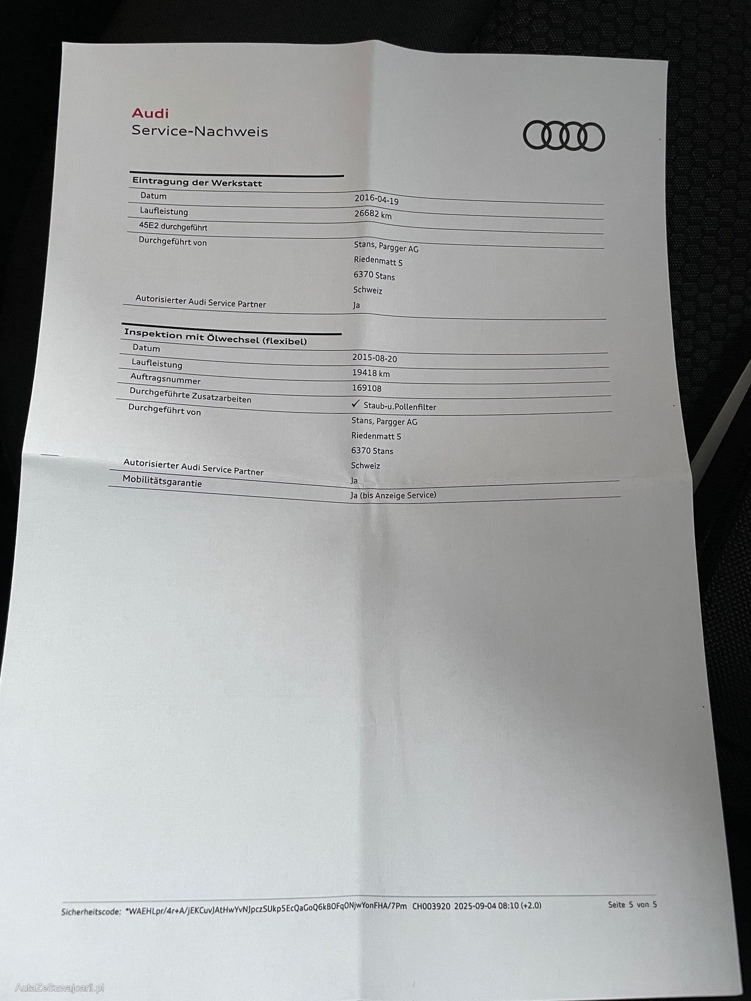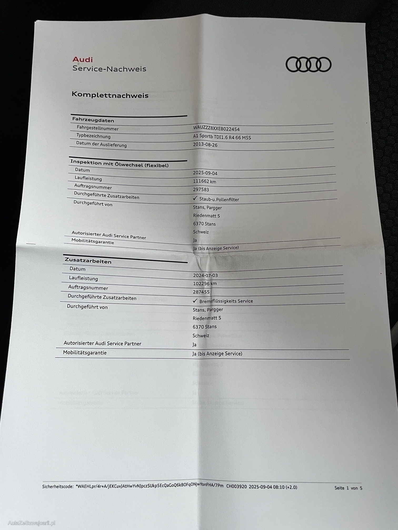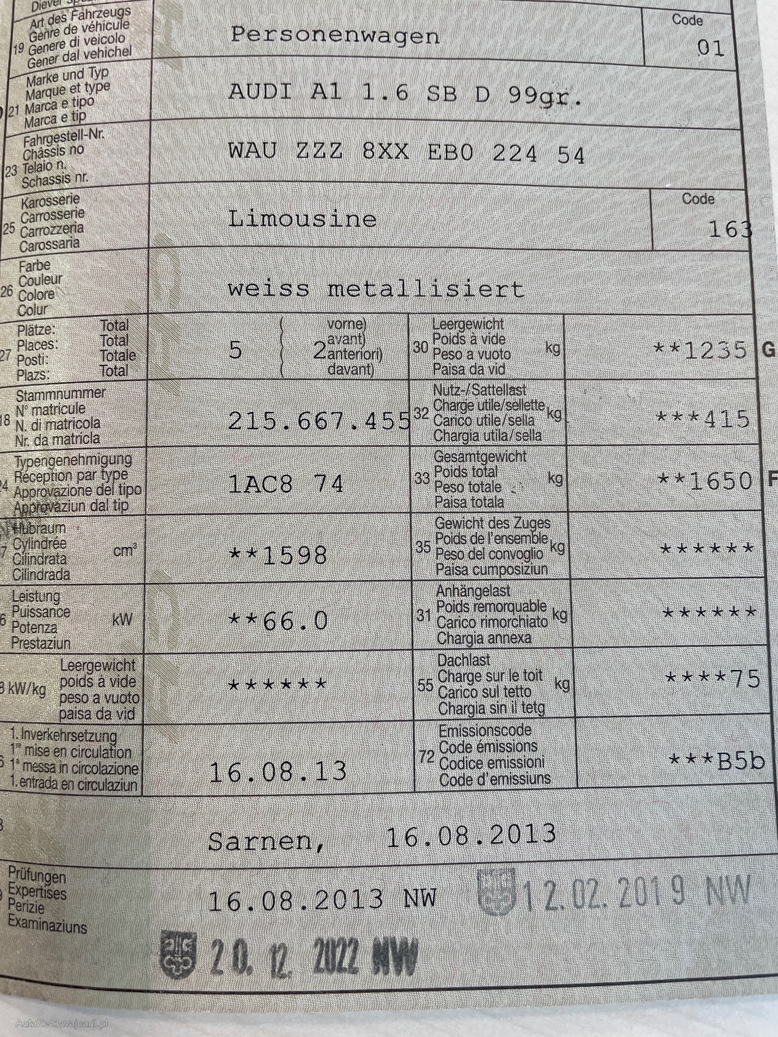 | Kommentar | Sehr gepflegtes Fahrzeug aus 1.Hand. Gute Ausstattung. MFK nicht bestanden wegen defektem Partikelfilter. Kein Werkstatttest und Funktionskontrolle durchgeführt. Ab Platz, ohne Garantie. Jede weitergehende gesetzliche Gewährleistung insbesondere Wandelung und Minderung werden abgelehnt. Im Kundenauftrag. |