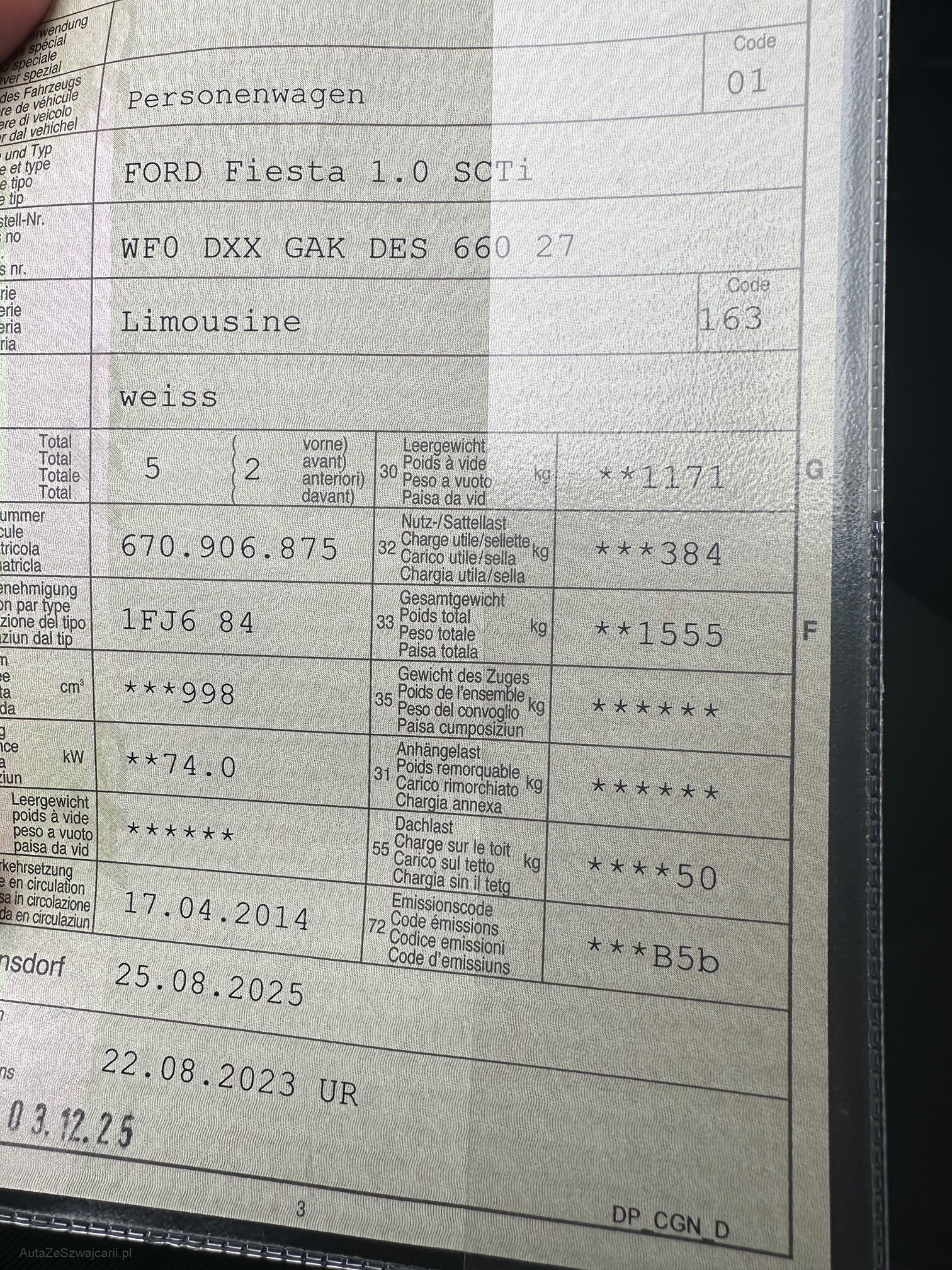 | Kommentar | Hiermit bieten wir diesen Ford Fiesta 1.0 Scti an. Fahrzeug ist noch im Kundenbesitz. Fahrzeug wurde nicht geprüft, da MFK frisch ist. Folgende Mängel sind bekannt: - Kratzer an Stossstange vorne siehe Bild - Diverse kleinere Kratzer und Steinschläge - Service im April fällig - Innenraum schmutzig. |