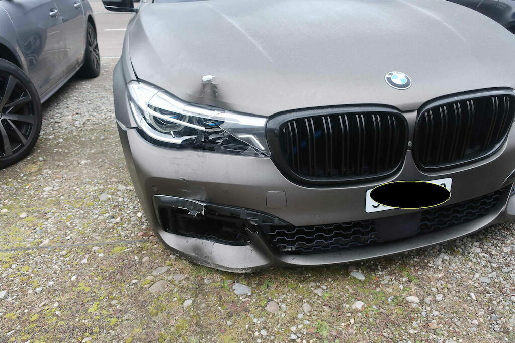 Front beschädigt, Stossfänger, Haube, Scheinwerfer rechts deformiert. Radaufhängung vr gebrochen. Heckscheibe Kratzer
