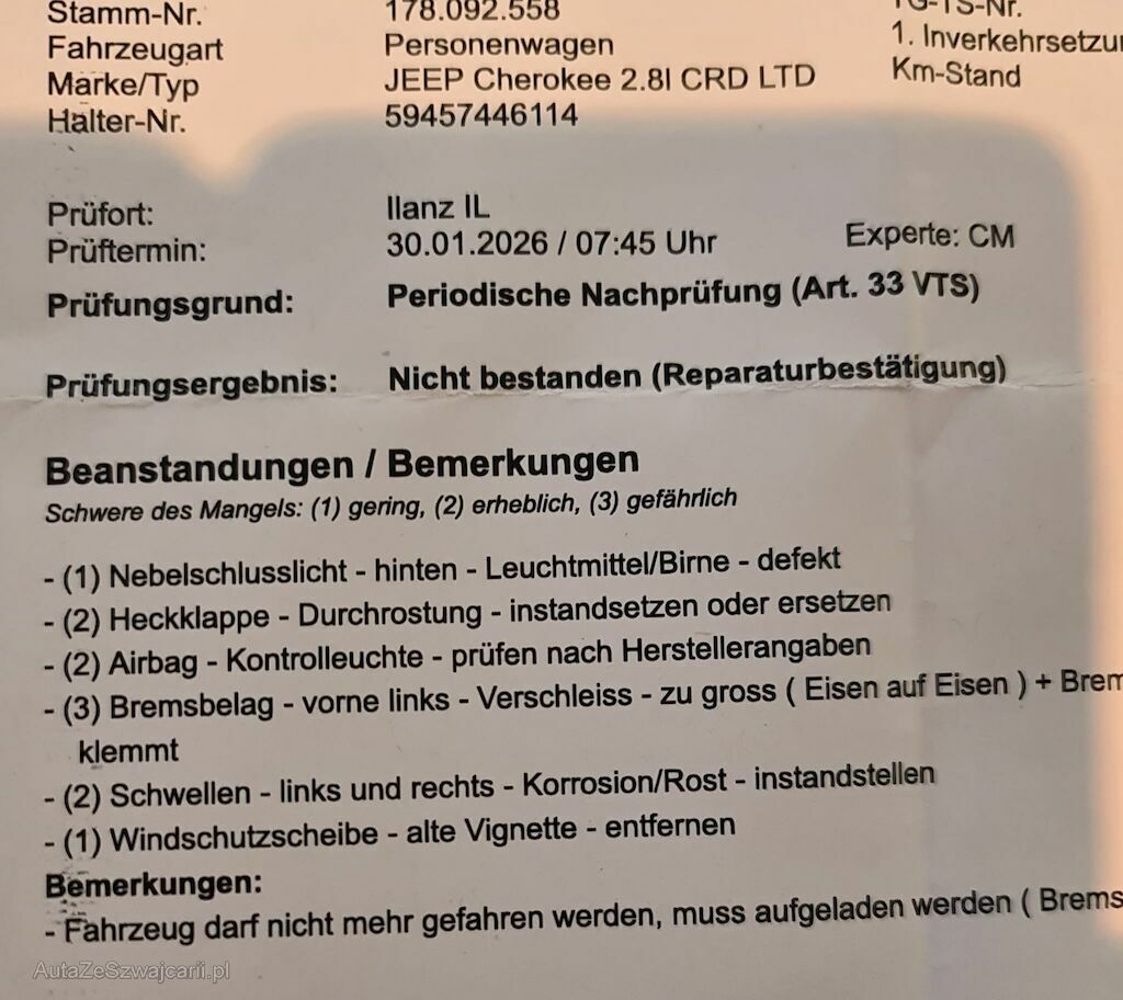 | Information | Muss innert 5 Arbeitstagen abgeholt werden, ansonsten werden Standkosten à CHf 15.- p. Tag verrechnet. Telefonische Voranmeldung 24h im Voraus, ohne Voranmeldung zuzüglich CHF 150.- Expressgebühr. Barzahlung bei Abholung, Fahrzeug wird wie abgebildet verkauft. Im Kundenauftrag zu verkaufen. |