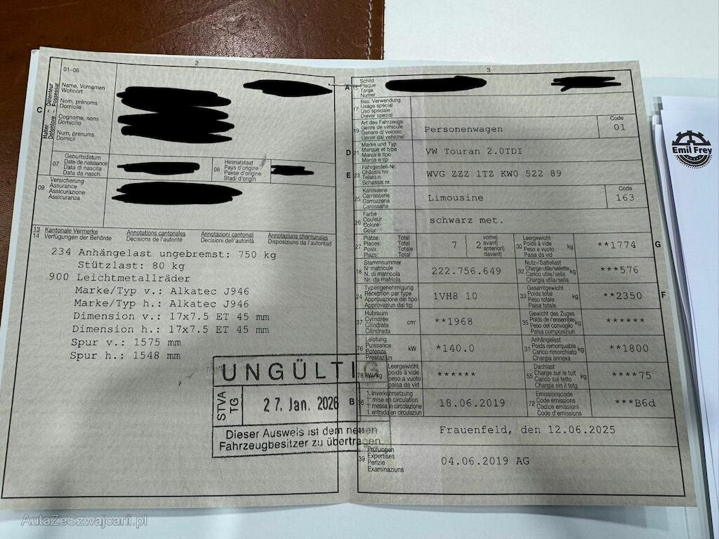 | Information | Keine Gewähr auf die Angaben der Sonder- und Serienausstattung / keine mechanische Prüfung. Fahrzeug wurde unzerlegt expertisiert / keine Haftung für allfällige, nach Demontage bekanntwerdenden Mängel. Fahrzeugbereifung und Ausstattung gemäss Fotos / Fahrzeugkauf auf eigenes Risiko ab Platz ohne Nachwährschaft. - Letzter Service am 17.11.2023 bei 101520km |