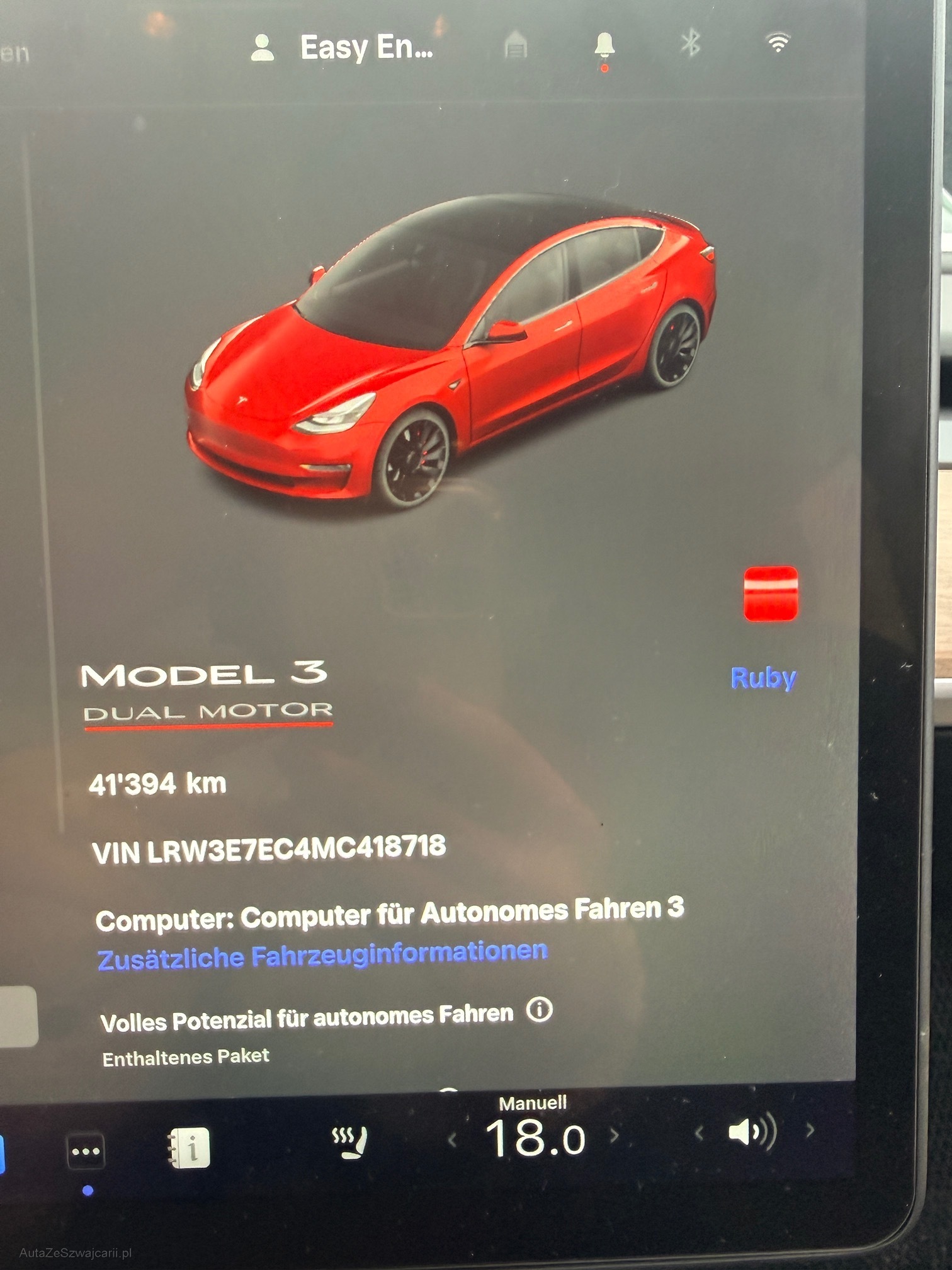 | Kommentar | Fahrzeug weist optisch keine Schäden auf ausser verkratzte Felgen (siehe Bilder) Mit Gebrauchsspuren rechnen 8-fach berädert Turbinenfelgen Batterie am 13.07.23 bei ca. 23‘000km ersetzt getönte Scheiben hinten und panorama Wandelung und Minderung sind ausgeschlossen! es wurde kein Test gemacht. |