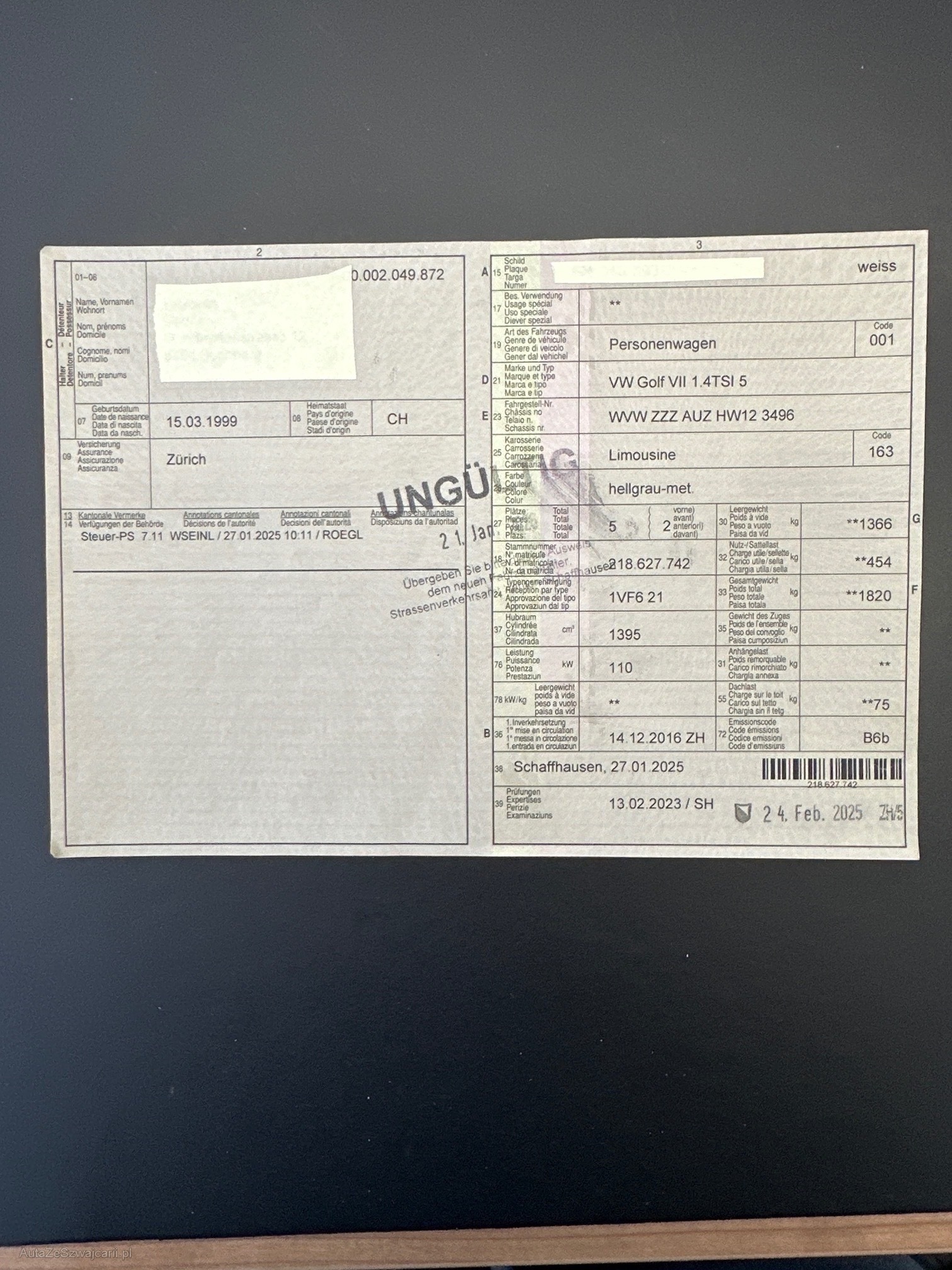 | Kommentar | Motorkontrolllampe leuchtet: - Wasserverlust Kühlmitteltemperaturgeber / Kühlmittel ist in den Kabelstrang vom Motorsteuergerät gelaufen. Es müssen folgende Ersatzteile ersetzt werden: - Kühlmitteltemperaturgeber, Leitungssatz für Motor und Motorsteuergerät. Carrosserie: - Stossfänger-Abdeckung vorne links im Bereich des Spoiler angefahren. - Ladekante an der Stossfänger-Abdeckung hinten verkratzt. Sommerräder: - Zustand der Leichtmetallfelgen und der Sommerreifen kann nicht beurteilt werden, da Sie noch zu Hause beim Kunden sind. -- Am Fahrzeug wurde kein Werkstatttest durchgeführt. Für Sichtbare, sowie nicht Sichtbare Mängel wird nicht gehaftet, da wir nicht alle Funktionen am Fahrzeug prüfen. Das Risiko liegt vollumfänglich beim Käufer. Nachdem der Höchstbietende den Zuschlag erhalten hat, gibt es keine Nachverhandlung, auch wenn nicht deklarierte Mängel zum Vorschein kommen sollten. Jede Gewährleistung, soweit nach Gesetz möglich, wird wegbedungen. Insbesondere sind Wandelung und Minderung ausgeschlossen. |
