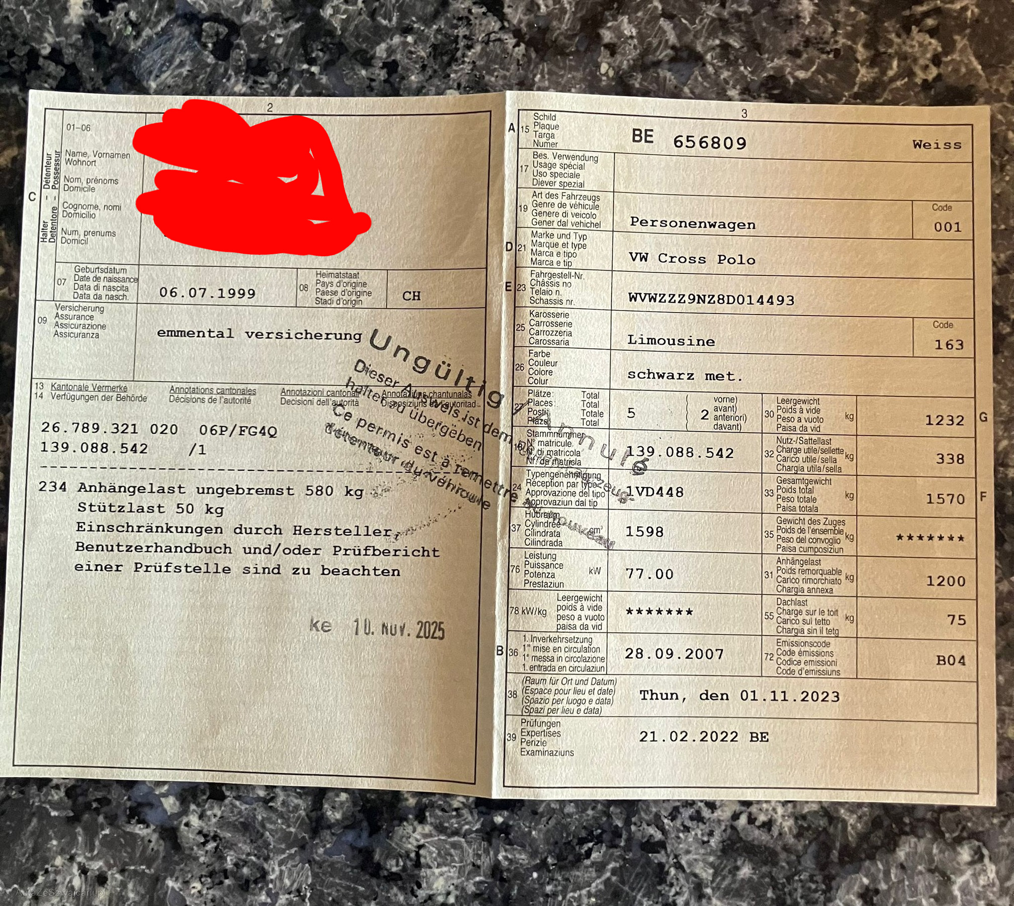 | Kommentar | Fahrzeug wird ab Platz und ohne jegendliche Garantie Verkauft. Verkauf in Kundenauftrag wegen umstieg auf Elektroauto. Am Fahrzeug wurde kein Werkstatttest durchgeführt und Schäden welche an der Carrosserie sichtbar sind wurden Fotografiert und für Schäden welche nicht sichtbar sind wird nicht gehaftet. Bremsen hinten fest. Nach der Auktion wird nicht über den Preis diskutiert. |