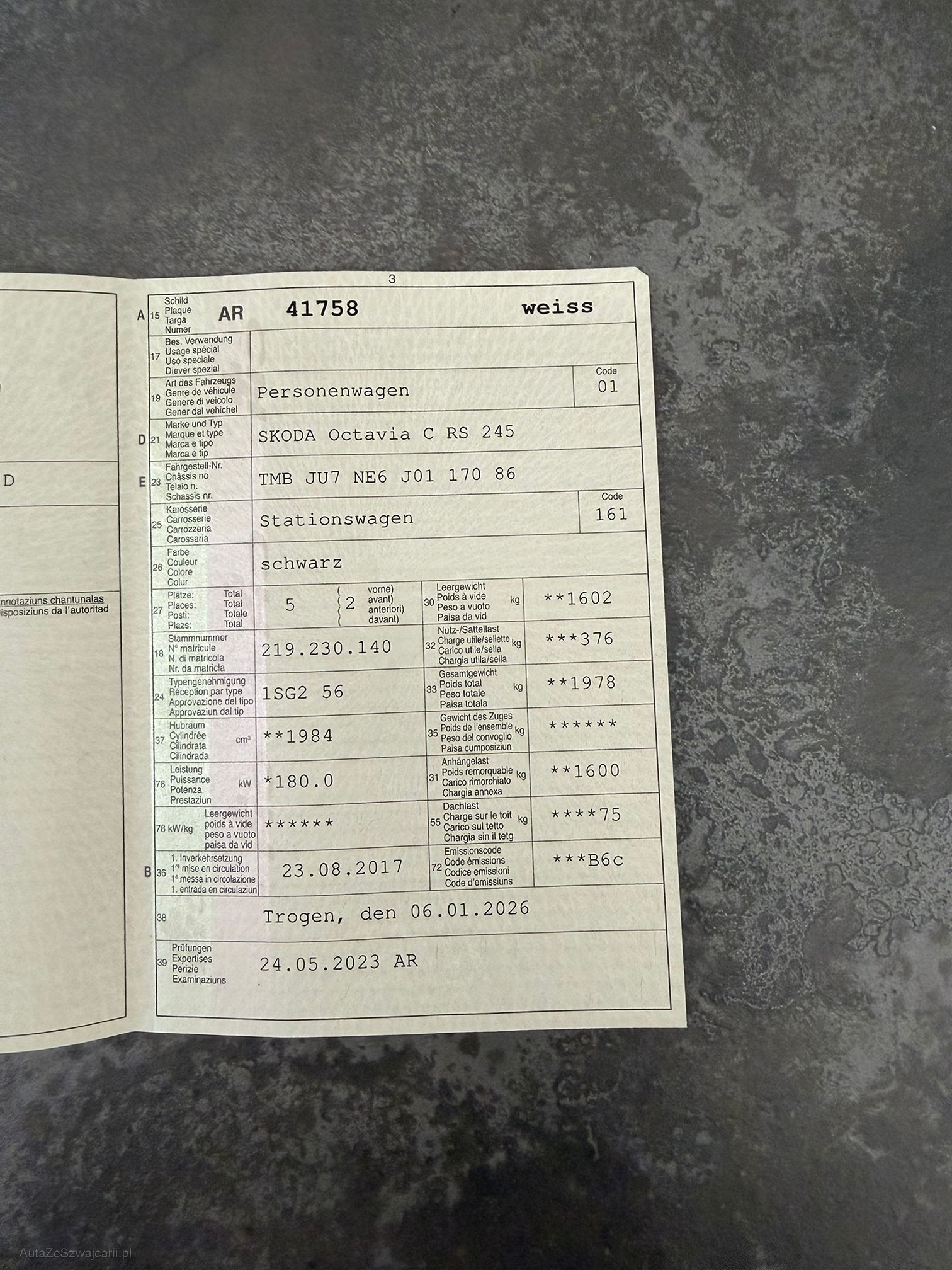 | Kommentar | Technisch nicht geprüft (Dieselpartikelfiltermessung durchgeführt = i.O siehe Bilder). Fahrzeug läuft und kann gefahren werden. Warnlampen leuchten keine 2 Schlüssel vorhanden sowie Serviceheft. Hat 4 Alu Räder Sommerreifen 4 Alu Räder Winterreifen. FZ optisch sowie innen im guten Zustand. Heckklappe muss neu programmiert werden oder Stossdämpfer ersetzt werden, geht nicht schön auf Fahrzeug muss innert 7 Tage abgeholt werden (Banküberweisung) |
