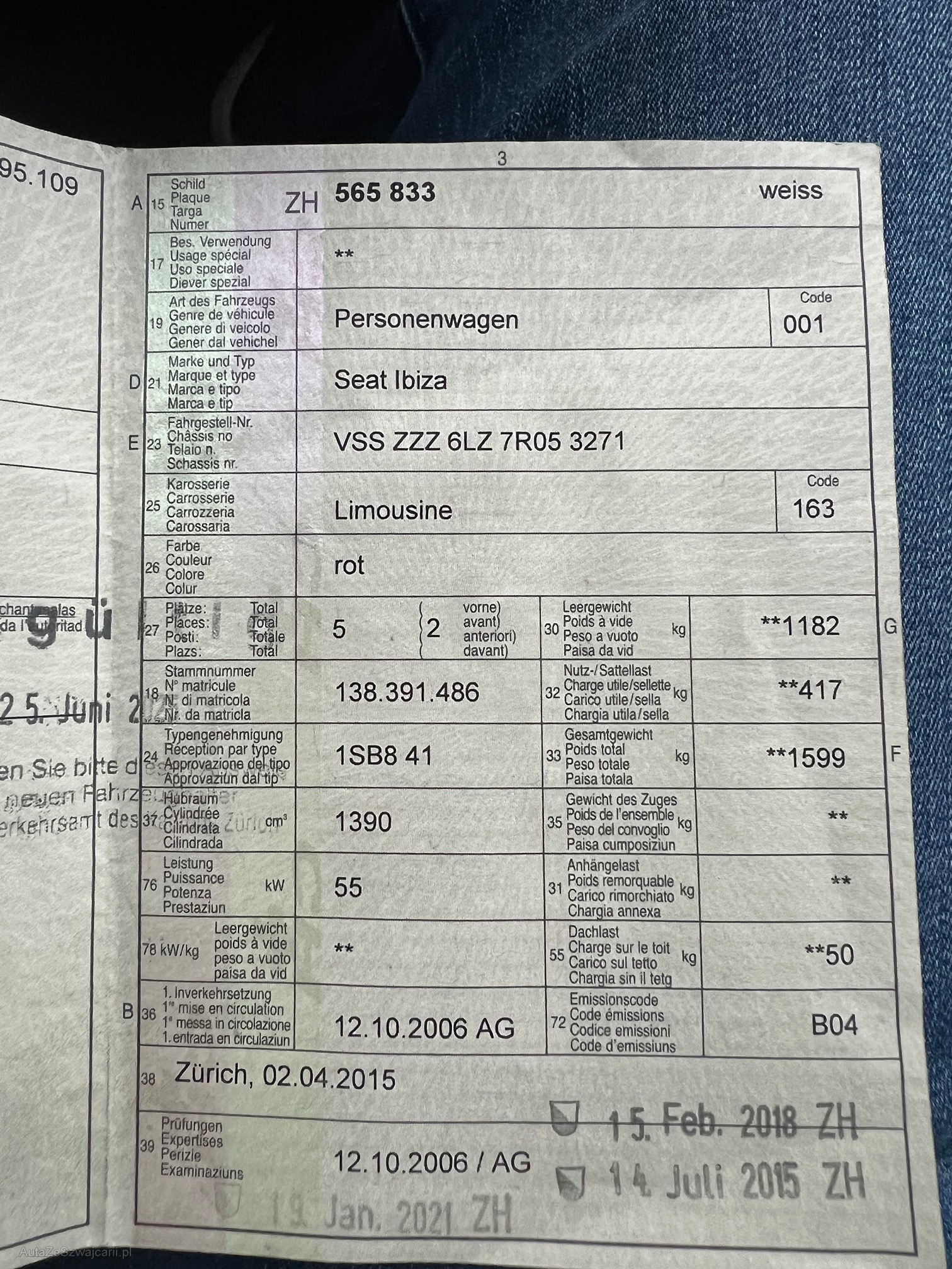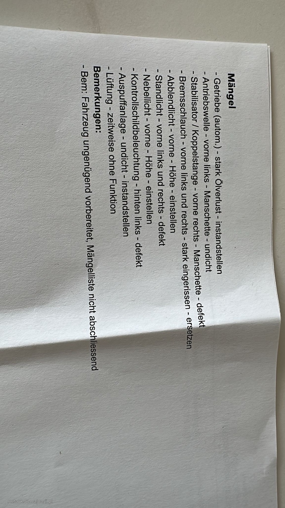 | Kommentar | - Kein Werkstatttest - Mängelliste vom StVa vorhanden (Technische Mängel im Ausweis) -Schäden Gemäss Fotos |