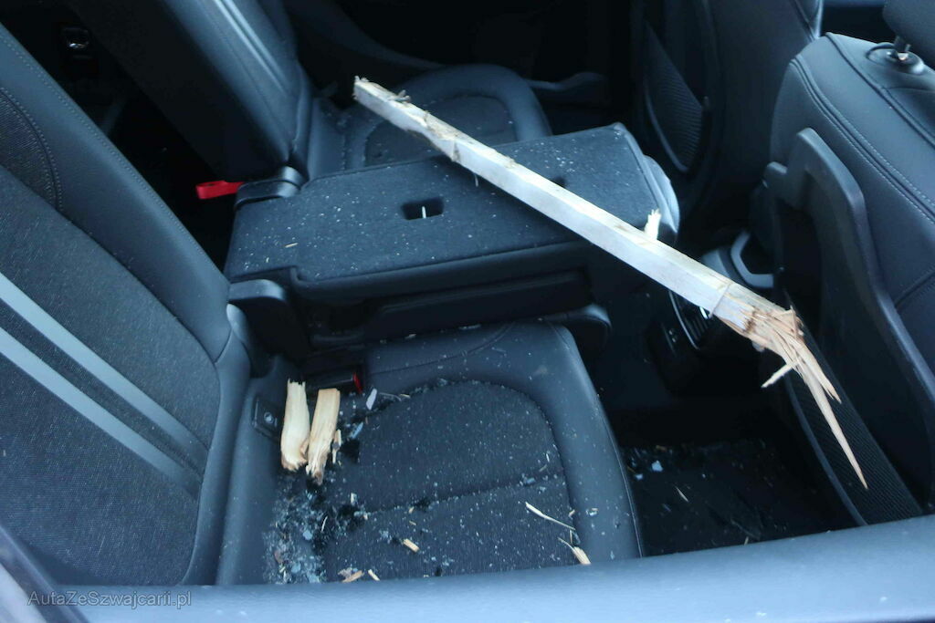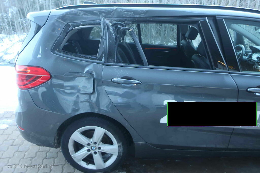 Türe hinten rechts, Seitenwand hinten rechts, Dachrahmen hinten rechts, Fenster eingeschlagen, Hinterachse beschädigt, Felge hinten rechts beschädigt. Leichte Delle im Dach