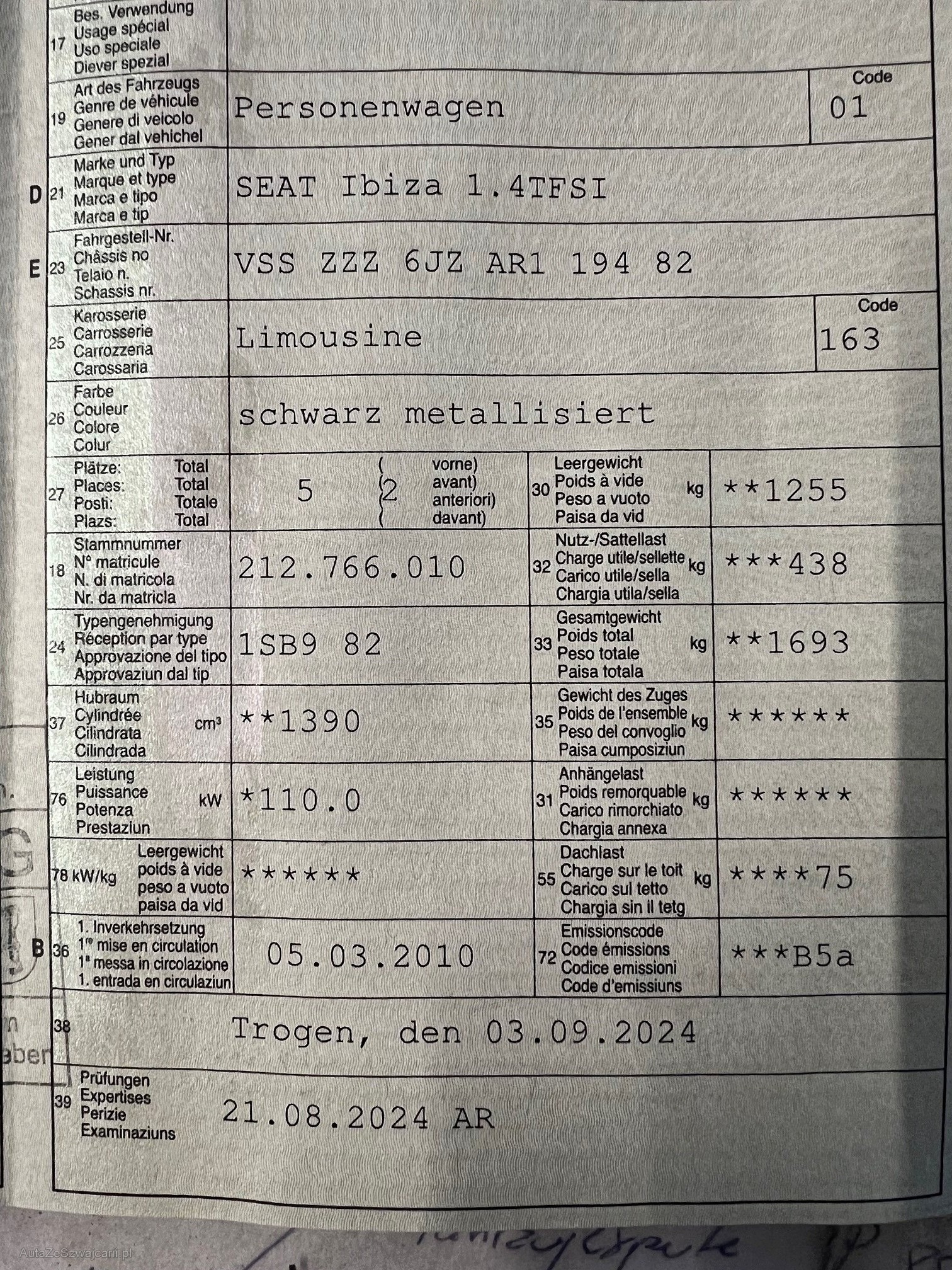 | Kommentar | Defekte Wasserpumpe Fahrzeug ist nicht Fahrbar auf weitere Strecken, weitere Mängel sind nicht ausgeschlossen. Muss zwingend innert 7 Tagen abgeholt werden. |