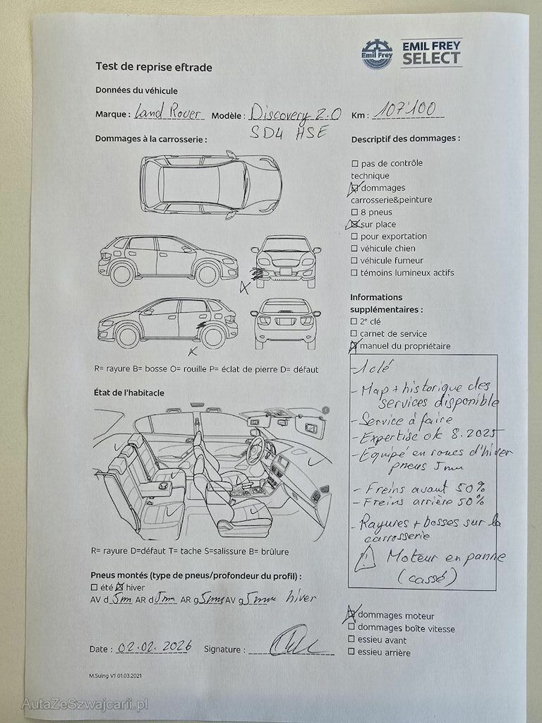 | Information | 1 clé Map + historique des services disponible Service à faire Expertise ok 19.08.2025 Equipé en roues d'hiver pneus 5mm Freins avant 50 % Freins arrière 50 % Rayures et bosses sur la carrosserie Défaut moteur ( casser ) |
