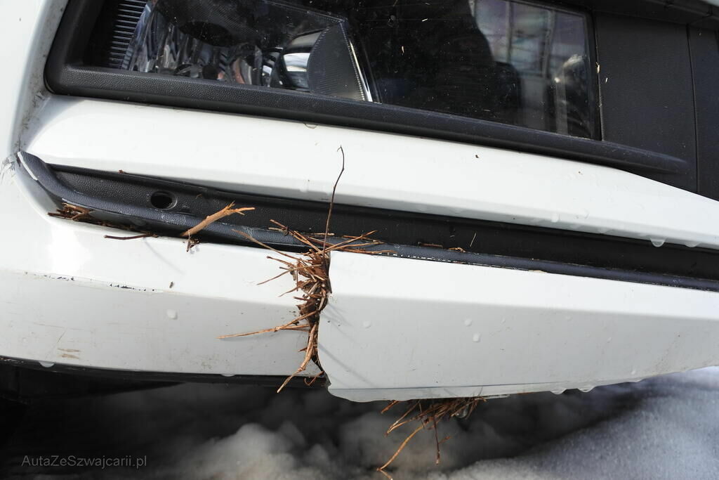 Die Stossstange mit Zierelementen, Spoiler, der Kotflügel sowie die Radhaufhänung inkl. Lenkgetriebe sind beschädigt. Das Scheinwerfergehäuse ist angerissen und verschieden Anbauteile im direkten Deformationsberecht beschädigt. Im Kombiinstrument kommen verschiedene Meldungen: z.B. aktiver Tempomat, Antischlupf, Service