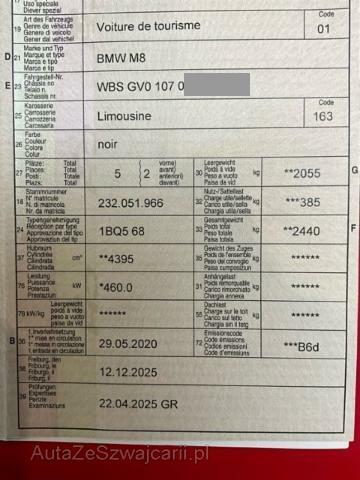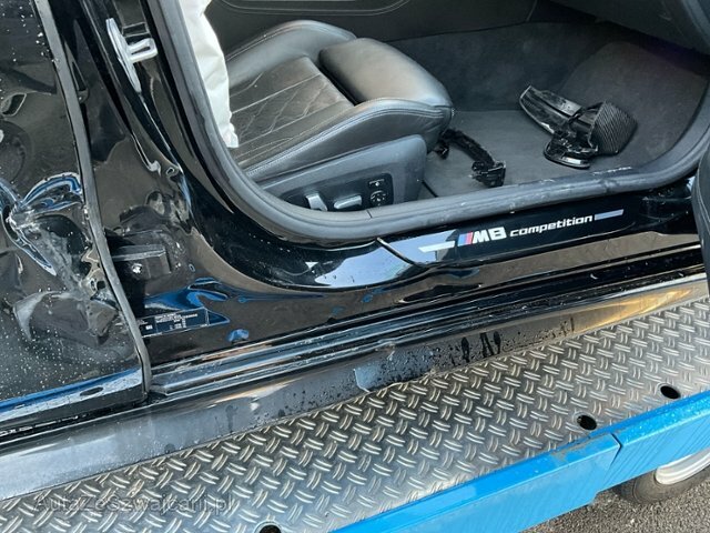 | Condition_and_Equipment | Zustand Fahrzeug muss transportiert werden (Höhe und Breite beachten). Fahrzeug ist NICHT fahrbar. Fahrzeug ist NICHT rollbar. Sonstiges Fahrzeugdokumente vorhanden. --- Rechts Rechte Seite beschädigt. Anstoss rechts im Bereich der B-Säule. Achse Risiko Lenkung. Innenraum Gurtstraffer vorne ausgelöst. Sonstige Schäden Div.Carrosserie Teile sind leicht beschädigt. --- Serienaustattung Fahrer und Beifahrer-Airbag Diebstahlwarnanlage Seitenairbag für Fahrer und Beifahrer Lenksäule elektrisch verstellbar Lordosenstütze für Fahrer und Beifahrer Elektrische Sitzverstellung mit Memory Sitzheizung für Fahrer und Beifahrer Reifendruck-Kontrollsystem RDC Durchladesystem Automatische Heckklappenbetätigung Antiblockiersystem ABS Servotronic Pack Aussenspiegel Kindersitzbefestigung Isofix Hochglanz Shadow-Line M-Lederlenkrad Soft Close Automatic für Türen M Heckspoiler Velours-Fussmatten Komfortzugang Uni-Lackierung Multifunktions-Lenkrad Kopfairbags vorne + hinten Park Distance Control PDC vorn und hinten M Sportsitze für Fahrer und Beifahrer Dachhimmel Alcantara anthrazit Regensensor und automatische Fahrlichtsteuerung Geschwindigkeitsregelung mit Bremsfunktion Fernlichtassistent Deaktivierung Beifahrerairbag Klimaautomat 2-Zonen inkl. Mikrofilter Digital audio DAB-Tuner Interieurleisten Carbon Fibre Ambientebeleuchtung Auto Start Stopp Funktion Adaptives M Fahrwerk Harman/Kardon Surround Sound System Keine Gewähr auf die Angaben der Serienausstattungen Active Protection ConnectedDrive Services Laserlicht BMW Service Plus 10 Jahre/ 100'000 km Display Schlüssel WLAN Hotspot Teleservice Intelligenter Notruf M Sportdifferential Pack Connected Professional Live Cockpit Professional BMW Repair 4 Jahre/ 200'000 km Ottopartikelfilter Telefonie mit Wireless Charging Parking Assistant Carbondach Driving Assistant Pack Competition Sonderausstattung Sonnenrollo für Hecksch.el./ Seitenrollo hinten mech. Klimakomfort/ Frontscheibe Sonnenschutzverglasung Aktive Sitzbelüftung vorn Integrierte Universal-Fernbedienung Metallic-Lackierung Klimaautomat 4-Zonen inkl. Mikrofilter Interieurleisten BIN Pianolack schwarz Night Vision mit Personenerkennung M Carbon Keramik Bremse Bowers & Wilkins Diamond Surround Sound System Sitzheizung vorne + hinten Pack Wärme-Komfort vorne Parking Assistant Plus Pack Carbon Exterieur Reifen-Pannenset Driving Assistant Professional |