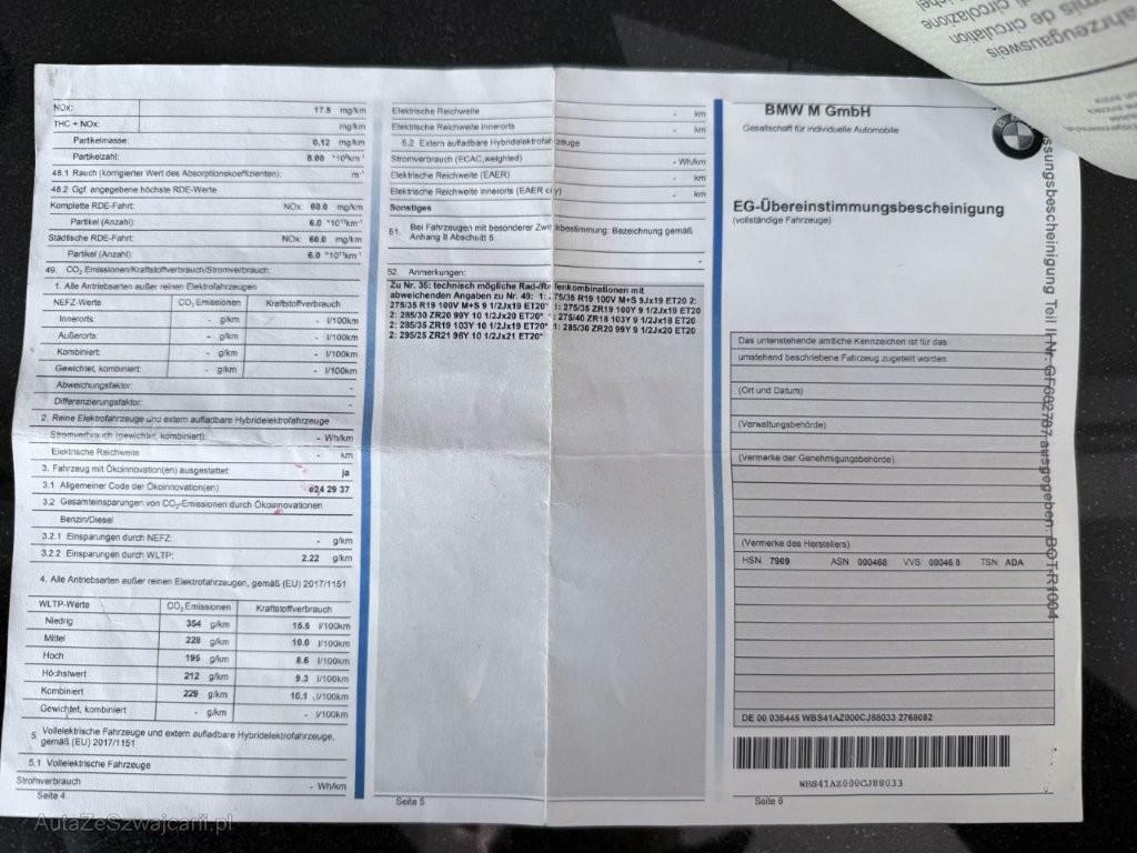 | Serienausstattung | Paket: Innen- und Aussenspiegelpaket, Assist: Park Distance Control vorne und hinten, Servotronic, Media: HiFi Lautsprechersystem - Digitaler Verstärker, 205 W Verstärkerleistung 10 Lautsprecher: - 1 Mitteltöner in der Armaturentafel - 3 Hochtöner in den Spiegeldreiecken und der Instrumententafel - 4 Mitteltöner in den Türverkleidungen vorne und hinten - 2 Zentralbässe unter den Vordersitzen, Getriebe: 8-Stufen-Sportautomat Steptronic, Alarmanlage, Aussenspiegel rechts und links beheizt und elektrisch verstellbar, asphärisch gewölbtes Spiegelglas, Fahrwerk: M Sportdifferential - Aktives M Differenzial - M spezifisch abgestimmtes, elektronisch geregeltes Hinterachs-Lamellensperrdifferential mit zusätzlichen Kühlrippen an Gehäuseunterseite - vollvariable Einstellung des Sperrgrads, je nach Fahrsituation und Fahrbahnbeschaffenheit zwischen 0 und 100%. Verbesserung von Traktion, Agilität, Stabilität sowie Fahrverhalten: - Traktion: Zuweisung von 'mehr Drehmoment' auf das Rad mit besserer Bodenhaftung - Agilität: gesteigertes Querbeschleunigungs- und Fahrdynamikpo, Fahrwerk: Adaptives M Fahrwerk - M spezifische Regelung der Stoßdämpfer Charakteristik. Einstellbar in die Modi 'Comfort', 'Sport' und 'Sport Plus' - Vorderachse: M spezifische Doppelgelenk-Federbeinvorderachse - Hinterachse: M spezifische 5-Lenker-Hinterachse, BMW Garantie: BMW Service Plus - Gewährleistung und Gratis-Reparatur bis 100'000 km oder 3 Jahre. Es gilt das zuerst Erreichte - Verschleissreparaturen, wie Ersatz von Bremsbelägen und Bremsscheiben, sowie sonstige Reparaturen übernehmen wir mit BMW Originalteilen während 100'000 km oder 3 Jahren. Zudem profitieren Sie von bis zu sechs saisonalen Räderwechseln (zwei pro Jahr) und dem Austausch der Wischerblätter. - Gratis-Service bis 100'000 km oder 10 Jahre. Es gilt das zuerst Erreichte,, Elektrische Fensterheber vorne, Warndreieck, Start-/Stop-Knopf, Licht: Nebelschlussleuchte, Lenkrad: Lenkrad längs- und höhenverstellbar, Dach in CFK Optik, Ambientes Licht - Mit Ambiente-Lichtdesigns - Umfasst 11 vordefinierte wählbare Lichtdesigns in 6 Farben (Orange, Grün, Blau, Flieder, Bronze und Weiss) - Ambiente Wasserfallbeleuchtung - Ambiente Fussraumbeleuchtung - Ambiente Kartentaschenbeleuchtung - Ambiente Ablagefachbeleuchtung der Mittelkonsole - Konturbeleuchtung in Instrumententafel und Türverkleidung - Ambiente Türöffnerbeleuchtung, Intelligenter Notruf, Sitze: M Sportsitze vorne, Auto Start Stop Funktion, Airbag: Airbag Fahrer und Beifahrer, M Hochglanz Shadow Line mit erweiterten Umfängen - Außenspiegelkappen und Heckspoiler in Schwarz Hochglanz - Endrohrblenden in Schwarzchrom, Elektronische Wegfahrsperre, Scheibenwaschdüsen beheizt, Schaltpunktanzeige, Parkbremse, elektromechanisch, Leuchtweitenregulierung, Innenspiegel, automatisch abblendend Abblendsteuerung mittels eingebauter Sensorik, die das von hinten einfallende Licht misst und bei berechneter Blendung den Innenspiegel entsprechend abblendet, Media: Freisprecheinrichtung mit USB-Schnittstelle, Innenbeleuchtung, Paket: Connected Package Professional, Räder: Radschraubensicherung, Media: DAB+ Tuner, BMW Garantie: Repair Inclusive - 3 Jahre/100.000 km Gültigkeit: 3 Jahre oder 100.000 Kilometer - es gilt das zuerst Erreichte, Antiblockiersystem (ABS), Media: BMW Live Cockpit Professional - Anzeigeverbund bestehend aus einem volldigitalem 12,3" Instrumentendisplay und einem hochauflösendem 10,25" Control Display - BMW Operating System 7, Navigationsfunktion - Intuitive Bedienmöglichkeiten wahlweise über den BMW Intelligent Personal Assistant - Persönliches Nutzerkonto Vierfach-Tuner mit Diversity-Empfang, RDS und TMC - 2 USB-Anschlüsse zum Laden und zur Übertragung von Daten, Bluetooth/WiFi-Schnittstelle - 4G LTE Connectivity: festverbaute SIM-Karte mit 4G Netz, Active Guard, Sitze: Sitzheizung für Fahrer und Beifahrer, Katalysator geregelt, 3-Punkt-Sicherheitsgurte auf allen Plätzen, Airbag: Airbag Beifahrer deaktivierbar, Räder: Reifendruck-Kontrollanzeige, Media: ConnectedDrive Services, Lenkrad: M Lederlenkrad, Klima: Klimaautomatik - 3-Zonen-Klimaautomatik mit erweiterten Umfängen - Beschlag- und Solarsensor - Aktivkohlefilter für Frisch- und Umluft - Standlüftung mit Timer und Direktbetrieb - Digitales Display Mittelkonsole hinten, Lenkrad: Multifunktionslenkrad, Speed Limit Info, Airbag: Seitenairbag für Fahrer und Beifahrer, Regensensor, M Drive Professional - M Track Mode - M Laptimer - M Traction Control (10-stufig) - M Drift Analyser, Licht: Begrüssungslicht, Paket: Ablagenpaket Innenraum: Klappfach Instrumententafel unten, Fahrerseite Gepäckraum: - Trennetz an Seitenverkleidung links/rechts - Taschenhaken beidseitig im Gepäckraum - zusätzliche 12V Steckdose, Assist: Crash-Sensor, Sitze: Lordosenstütze für Fahrer und Beifahrer - Verstellung von Höhe und Tiefe in der Rückenlehne, Assist: Geschwindigkeitsregelung mit Bremsfunktion Geschwindigkeitsregelung ab ca. 30 km/h auch bei Bergabfahrten durch zusätzlichen Bremseingriff, Bedienung über Multifunktionslenkrad, Anzeige der Wunschgeschwindigkeit und des Betriebsmodus in der Instrumentenkombination, Fahrer kann Funktion jederzeit übersteuern., Räder: Reifen Pannen Anzeige, Getränkehalter, Dekor: Interieurleisten schwarz hochglänzend mit Akzentleisten Perlglanz Chrom, Seitenaufprallschutz, Einstiegsleisten, BMW Mobile Care - BMW Mobile Care: Pannen- und Unfallhilfe - Die BMW Pannen- und Unfallhilfe ist an 365 Tagen im Jahr rund um die Uhr im In- und Ausland für Sie da und das bis zu fünf Jahre nach der Erstzulassung Ihres Fahrzeugs., Sitze: Durchladesystem, Licht: Heimleuchten, Dynamische Stabilitäts Control (DSC) mit erweiterten Umfängen, Kennzeichenbeleuchtung in LED, Polster: Leder Merino mit erweiterten Umfängen Schwarz, Räder: 19"/20" M Schmiederäder Doppelspeiche 826 M Schwarz - mit Mischbereifung voren: 9,5J x 19, 275/35 R19 hinten: 10,5J x 20, 285/30 R20, Airbag: