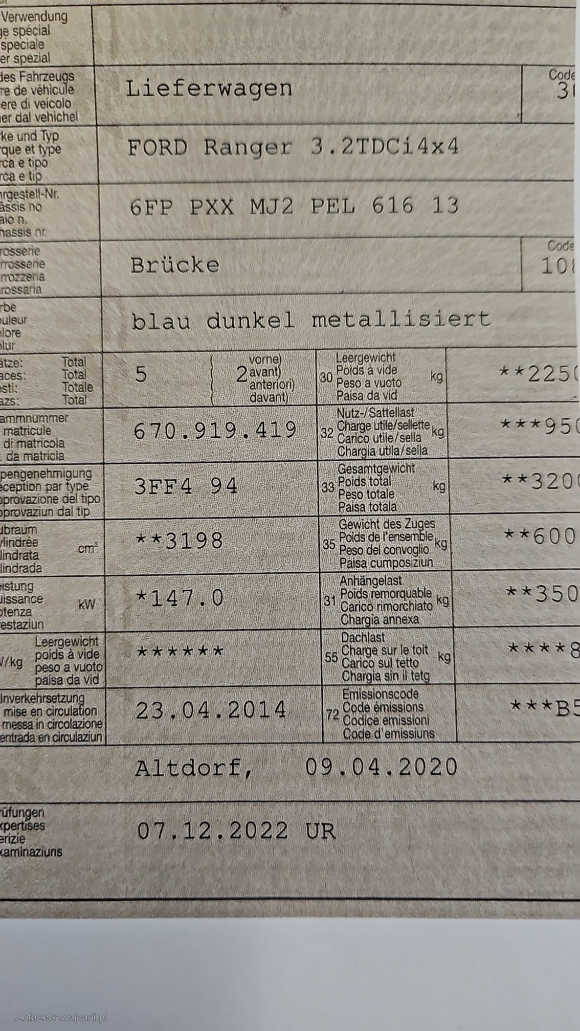 | Kommentar | - Motor wurde mit 209251km am 02.2022 ersetzt (Original Ford Ersatzteil) - MFK Mängel bitte beachten: DPF defekt; Schlusslicht links; Aupsuffanlage Felxrohr lose; Federblatt hinhten rechts gebrochen; Lichteinstellung |