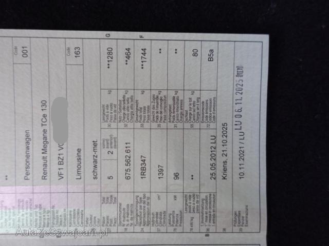 | Condition_and_Equipment | Zustand Fahrzeug ist fahrbar. Weitere wichtige Hinweise Motor läuft! --- Weitere Beschädigungen Stossstange Oberteil hinten deformiert, Stossstange Unterteil hinten gebrochen Vorschäden: Hagelscahden --- Serienaustattung Klimaanlage Airbag Fahrer und Beifahrerseite Elektronische Wegfahrsperre Zentralverriegelung Elektrische Fensterheber vorne + hinten Aussenspiegel elektrisch verstellbar und heizbar Bordcomputer Seitenairbag Fahrer und Beifahrerseite Nebelscheinwerfer Höhenverstellbarer Fahrersitz manuell Geteilte Rücksitzlehne 1/3, 2/3 Lenkrad verstellbar ABS und EBV Elektr. Bremskraftverteilung Lederlenkrad mit Lederschaltknauf Deaktivierung Beifahrerairbag Lendenwirbelstütze Fahrersitz Bremsassistent EBA Isofix-Kindersitzbefestigung Windowbags vorne + hinten ESP/ ASR/ CSV Tempomat mit Geschwindigkeitsbegrenzer Regen- und Lichtsensor Elektrische variable Servolenkung Reifen-Pannenset Show-me-home Lichtfunktion Renault Chipkarte Keyless LED Tagfahrlicht Aussenspiegel elektrisch einklappbar Leichtmetallfelgen 17" schwarz Radio/ CD/ MP3/ Bluetooth/ Bose Navigationssystem TomTom mit Europakarte Keine Gewähr auf die Angaben der Serienausstattungen Sonderausstattung Metallic-Lackierung |