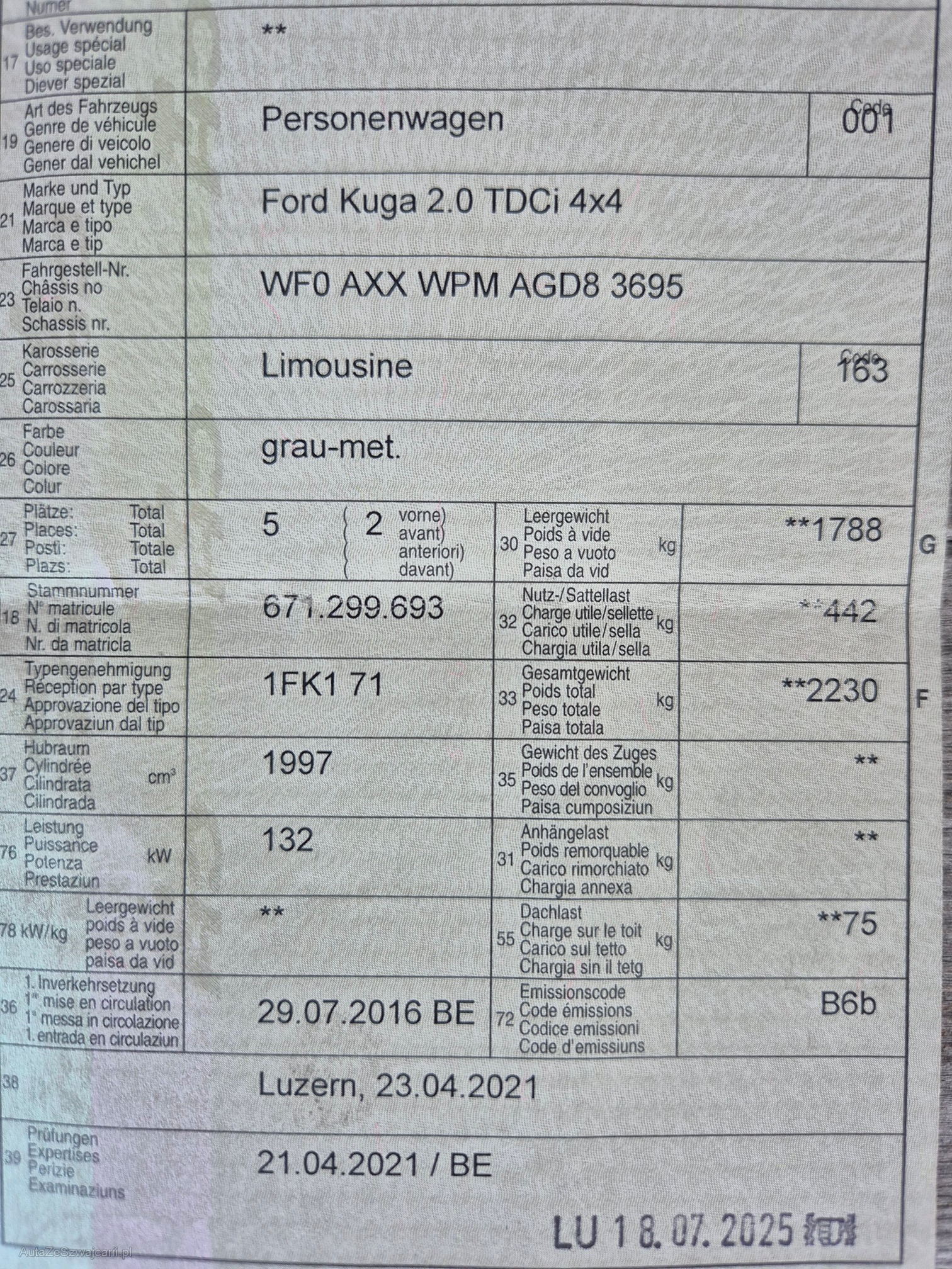| Kommentar | Fahrzeug verbraucht Wasser, sehrwahrscheindlich Zylinderkopfdichtung defekt, Motor raucht nicht Fahrzeug ist problemlos fahrbar Gebrauchtspuren, Kratzer (siehe Foto) Fahrzeug ohne Garantie ab Platz Abholung nach Auktionsende innert 10 Tagen, ansonsten wir eine Standgebühr von 15.- Fr. pro Tag verlangt. |