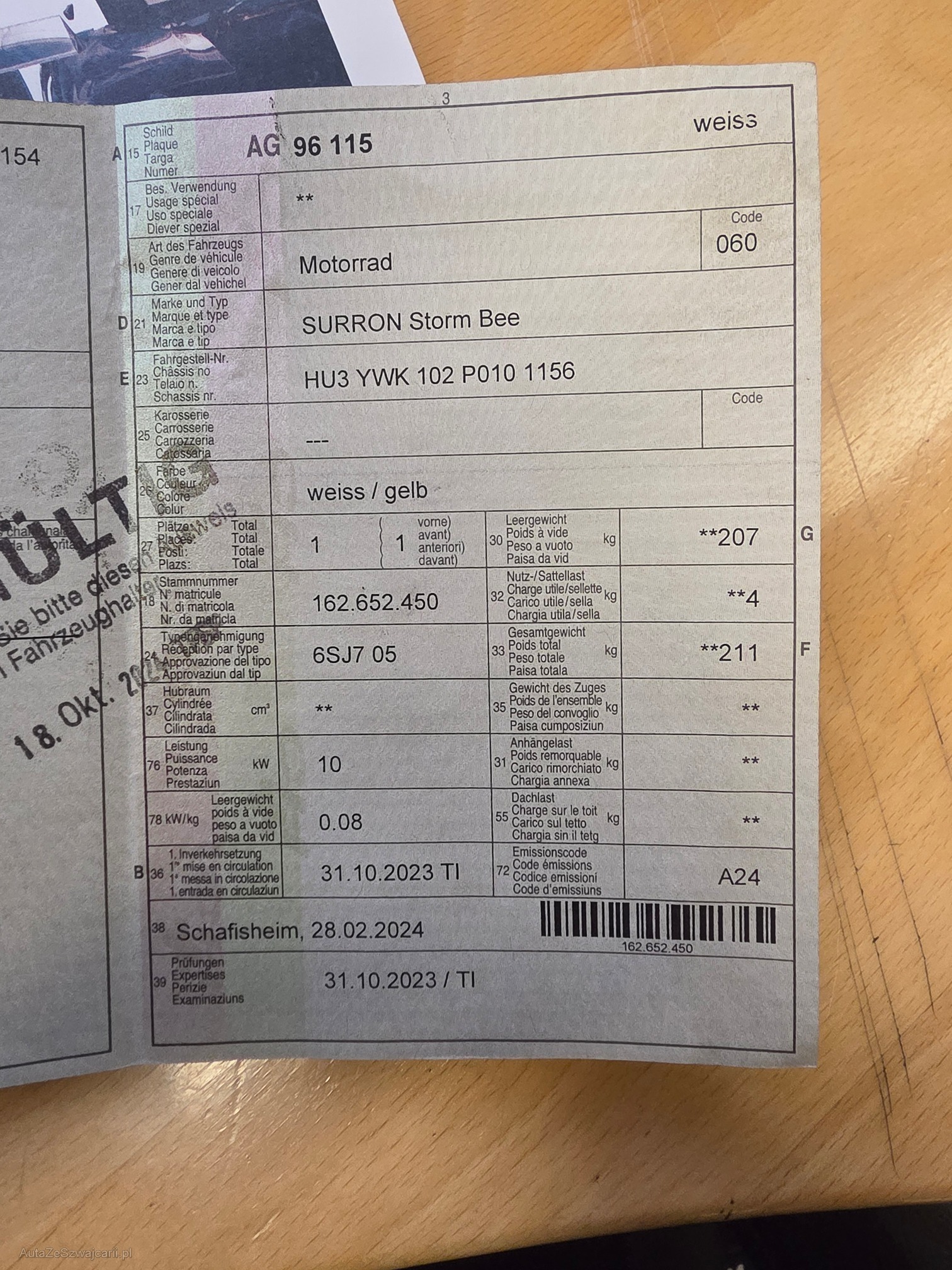 | Kommentar | Sur-Ron Storm Bee – Strassenzulassung – 10 kW – Top Zustand Zum Verkauf steht eine Sur-Ron Storm Bee mit Strassenzulassung. Kraftvolles E-Motorrad mit viel Drehmoment und Fahrspaß – ideal für Alltag und Landstrasse. Highlights: 10 kW Leistung Strassenzulassung / Typengenehmigung Erstzulassung: 31.10.2023 Reichweite bis ca. 200 km (je nach Fahrweise) Farbe: weiss / gelb 1 Sitzplatz Leergewicht ca. 207 kg Emissionscode A24 Zustand & Nutzung: Nur 1 Sommer gefahren Kein Offroad, ausschliesslich Strasse Laufleistung: ca. 600 km Mängel (transparent angegeben): Bremshebel leicht beschädigt Gummi beschädigt, jedoch nicht störend und voll funktionstüchtig Motorrad ist technisch einwandfrei und fährt problemlos. Alle dokumente und Ladegerät dabei |