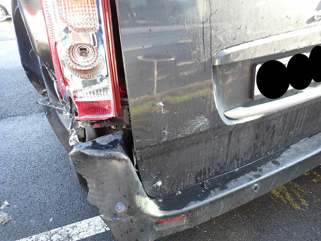 Choc arrière gauche: pare-chocs, capteur de parc, feu, tôle de fermeture, montant, panneau latéral arrière, panneau latéral central, vitre latérale arrière, hayon, enjoliveur de roue, endommagés.