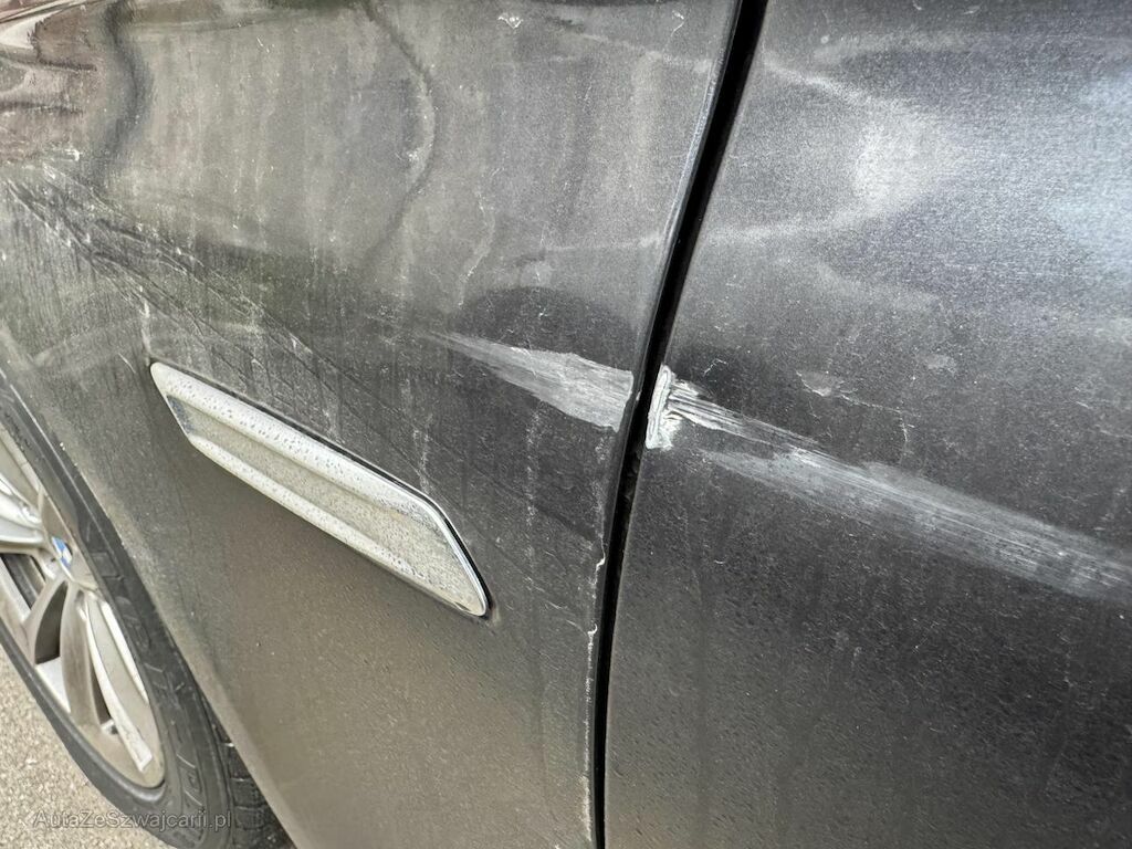 Kotflügel, beide Türen und Seitenwand deformiert. Stossstange vorne und Alufelge vorne links beschädigt.