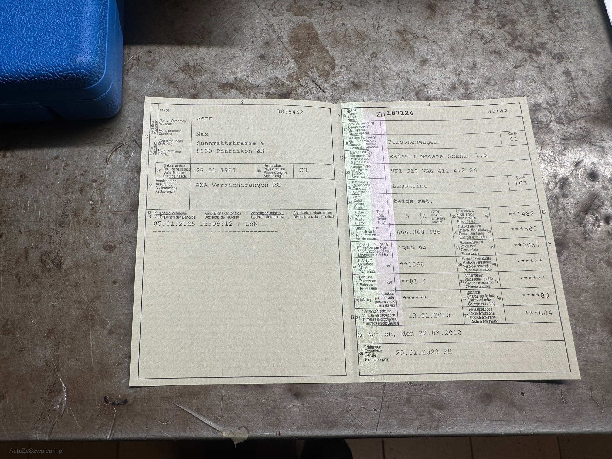| Kommentar | Fahrzeug nicht fahrbar Feder vorne Links gebrochen! Am Fahrzeug wurde kein Werkstatttest gemacht (Für sichtbare oder nicht sichtbare Mängel wird nicht gehaftet). Wir testen & kontrollieren nicht alle Funktionen vom Fahrzeug. Das Risiko liegt somit vollumfänglich beim Käufer. Nachdem der Höchstbietende den Zuschlag erhalten hat, gibt es keine Nachverhandlung, auch wenn nicht deklarierte Mängel zum Vorschein kommen sollten. Ab Platz ohne Garantie, Wandelung und Minderung werden wegbedungen. Fahrzeug muss nach der Zusprache innerhalb von 5 Tage abgeholt werden ansonsten werden 30.- Fr. Pro Tag verrechnet. |