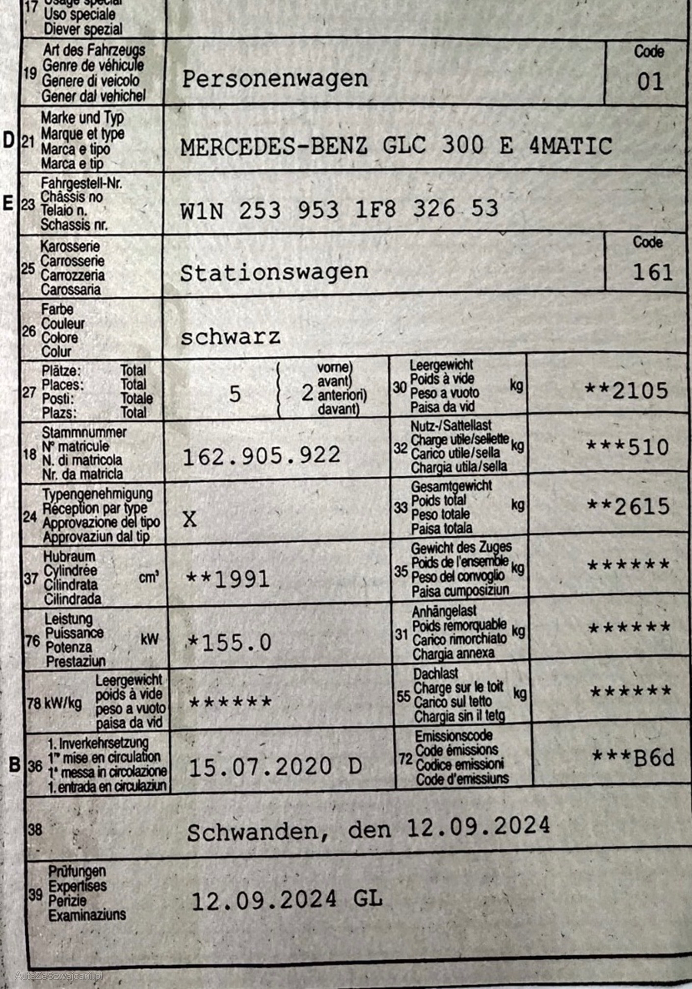 | Kommentar | Am Fahrzeug wurde kein Werkstatttest gemacht (Für sichtbare oder nicht sichtbare Mängel wird nicht gehaftet). Wir testen & kontrollieren nicht alle Funktionen vom Fahrzeug. Das Risiko liegt somit vollumfänglich beim Käufer. Nachdem der Höchstbietende den Zuschlag erhalten hat, gibt es keine Nachverhandlung, auch wenn nicht deklarierte Mängel zum Vorschein kommen sollten. Ab Platz ohne Garantie, die Gewährleistung ist vollständig ausgeschlossen, damit insbesondere auch Wandelung und Minderung. _ Sonderausstattung gemäss Eurotax ohne Gewähr _ Media: Vorrüstung für Fahrzeugfernsteuerung Fahrwerk: Federung für grössere Bodenfreiheit Dekor: Zierelemente in Klavierlack-Optik schwarz / Aluminium Ladeanschluss für Wechselstrom 7,4kW EASY-PACK-Heckklappe mit elektrischer Betätigung zum Öffnen und Schliessen Ladekabel für Wallbox und öffentliche Ladestationen, 4m,spiralisiert Lackierung: Uni-Lackierung Polster:Polsterung Ledernachbildung ARTICO / Microfaser DINAMICA Media: Smartphone Integration Sitze: Beifahrersitz elektrisch verstellbar mit Memory-Funktion Sitze: Fahrersitz elektrisch verstellbar mit Memory Lenkrad: Multifunktionslenkrad beheizbar Volldigitales Instrumenten-Display Licht: MULTIBEAM LED Scheinwerfer Warnweste für Fahrer Dekor: Zierelemente Esche schwarz/Aluminium Trittbretter in Aluminiumoptik mit Gumminoppen Akustikglas Sitze: Rücksitze heizbar Sitze: Vordersitze heizbar Scheibenwaschanlage und Scheibenwaschdüsen beheizt Paket: Park-Paket mit 360 -Kamera inkl.aktiver Park-Assistent und PARKTRONIC Paket: Spiegel-Paket Diebstahlwarnanlage mit Innenraumüberwachung und Abschleppschutz Paket:Night-Paket Paket: Konnektivitäts-Paket Dekor:Instrumententafel in Ledernachbildung ARTICO |