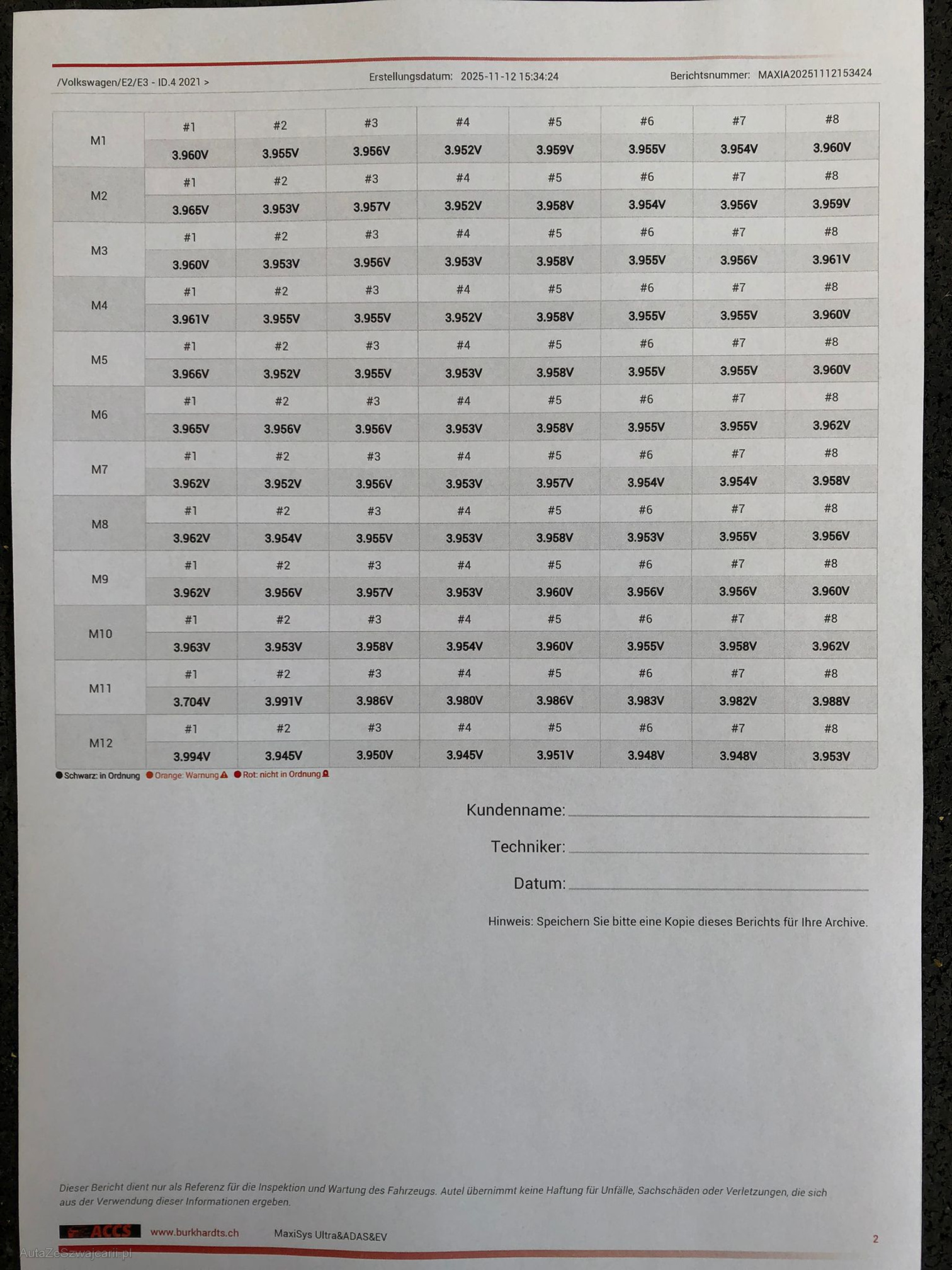 | Kommentar | - 2 Module hatten eine zu hohe Spannungsdifferenz, diese wurden durch gute Occ. Module getauscht. Der SOH wert liegt bei ca. 71%. Die Max. Reichweite bei 100% Ladung liegt bei 250-270km -Das Fahren und Laden ist kein Problem - Schlüssel müssten warscheindlich neu angelernt werden aufschliessen geht nicht mehr Am Fahrzeug wurde kein Werkstatttest gemacht (Für sichtbare oder nicht sichtbare Mängel wird nicht gehaftet). Wir testen & kontrollieren nicht alle Funktionen vom Fahrzeug. Das Risiko liegt somit vollumfänglich beim Käufer. Um Missverständnisse zu vermeiden kann das Fahrzeug auf Voranmeldung besichtigt & getestet werden, sollten Sie davon bewusst kein Gebrauch machen dann liegt die Verantwortung bei Ihnen. Nachdem der Höchstbietende den Zuschlag erhalten hat, gibt es keine Nachverhandlung, auch wenn nicht deklarierte Mängel zum Vorschein kommen sollten. Ab Platz ohne Garantie, Wandelung und Minderung werden wegbedungen |