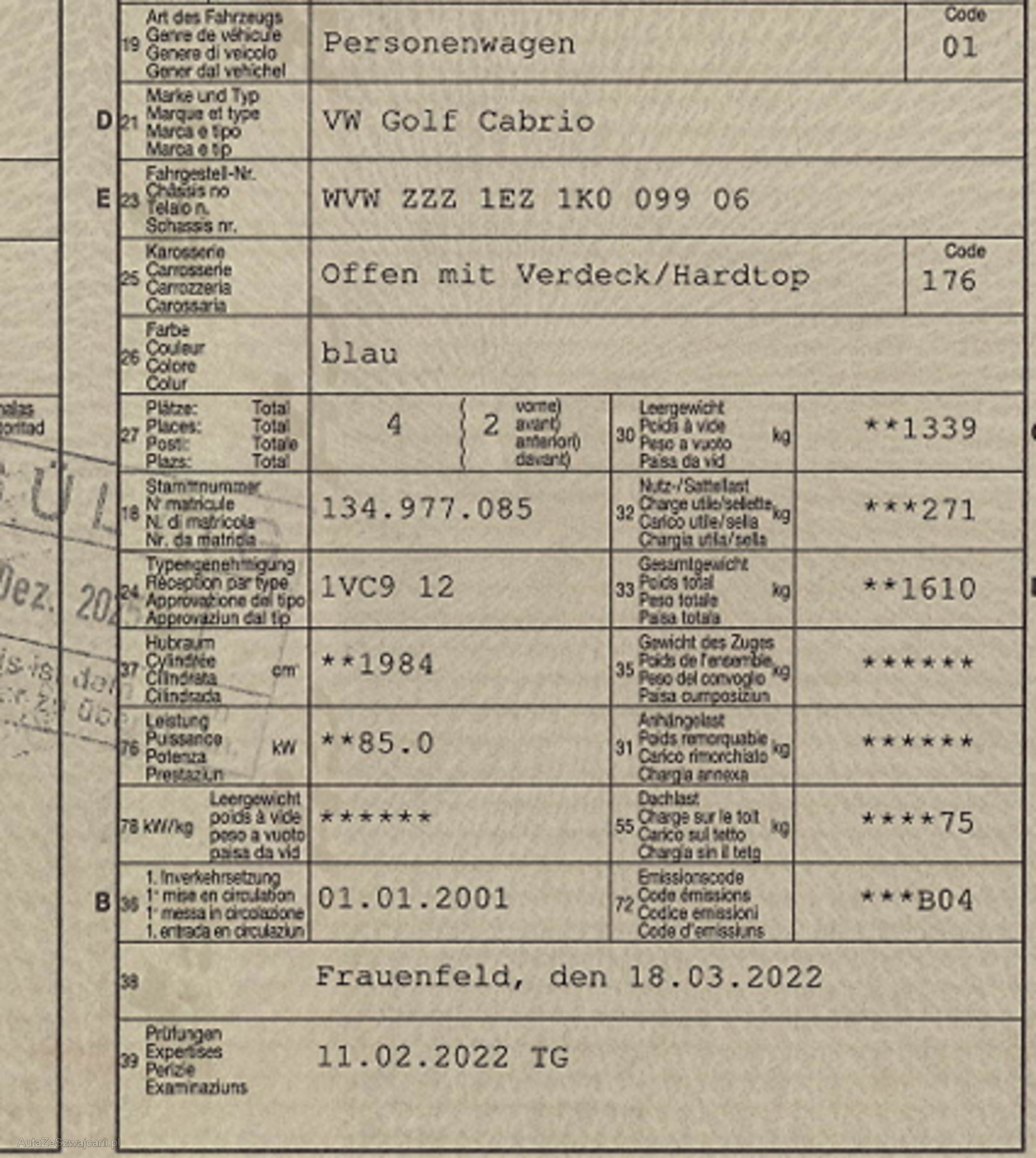 | Kommentar | + Fahrzeug grundsätzlich in einem guten Zustand, innen sehr sauber + Super Basis für Youngtimer + Fahrzeug einwandfrei fahrbar + letzte MFK Februar 2022 + Zahnriemen ersetzt 2022 bei KM 211'309 + letzter Service März 2022 bei KM 211'309 Bekannte Mängel: + Schloss Fahrerseite schliesst nicht + Bremsen vorne sollte ersetzt werden + Keilriemen rissig + VDD schwitzt leicht + Schweller und Radläufe leicht Rost weitere Investitionen nicht ausgeschlossen |