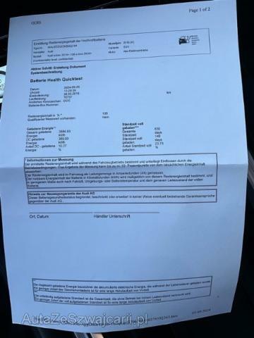 | Condition_and_Equipment | Zustand Fahrzeug ist fahrbar. Bereifung Fahrzeug wird mit Winterräder abgegeben. --- Links Linke Seite beschädigt. Anstoss links im Bereich der A-Säule. Anstoss links im Bereich der B-Säule. Anstoss links im Bereich der C-Säule. Anstoss links im Bereich der D-Säule. Achse Risiko Vorderachse. Hochvoltfahrzeug Keine sichtbaren Schäden am Antriebsakku Weitere Beschädigungen Felge vorne links --- Serienaustattung Mittelarmlehne vorne Tempostat Aussenspiegel elektrisch verstellbar und heizbar Airbag Fahrer und Beifahrerseite Seitenairbag Fahrer und Beifahrerseite Seitliches Kopfairbagsystem SIDEGUARD Radschrauben mit Diebstahlsicherung Nichtraucher- Ausführung Scheinwerfer Reinigungsanlage ABS und EBV Elektr. Bremskraftverteilung ESP Elektronisches Stabilitätsprogramm Adaptive air suspension Radioempfang digital DAB Tirefit Pack Glanz Fussmatten vorn und hinten 12 V Steckdose Multifunktions-Lenkrad 4-Speichen/ Schaltfunktion Isofix Kindersitzverankerung für Rückbank Einstiegsleisten Aluminium Reifendruck-Kontrollanzeige Audi music interface Innenspiegel automatisch abblendbar Normalsitze vorne Audi Sound System Rücksitzlehne geteilt umklappbar Audi Lane Assist (Spurverlassenswarnung) Isofix Kindersitzverankerung für Beifahrersitz Gepäckraumklappe elektrisch öffnend und schliessend LED-Scheinwerfer Bluetooth Schnittstelle Deaktivierung Beifahrerairbag Audi pre sense basic Audi Parking System plus Keine Gewähr auf die Angaben der Serienausstattungen Komfort Klimaautomatik Audi pre sense front Audi virtual cockpit Audi connect Notruf & Service Audi connect Navigation & Infotainment MMI Navigation mit MMI touch response Kontrastlackierung Sonderausstattung Sitzheizung für Vorder- und Hintersitze Aussensp. el. verstellbar/ heizbar/ abblendbar/ anklappbar Sportsitze vorne Dachhimmel schwarz/ Stoff Dachreling schwarz Reifendruck-Kontrollsystem RDK Lenksäule Neigungs- und Axialverstellung elektrisch Klimaautomat Vier-Zonen Komfort-Mittelarmlehne vorne Leder Valcona Servoschliessung Türen vorne und hinten Volllackierung Vordersitze elektrisch verstellbar/ Fahrersitz mit Memory Panorama-Glasdach Einstiegsleisten Aluminium beleuchtet Anschlussgarantie für das 4.+ 5. Jahr/ 100'000 km Vorbereitung für Anhängevorrichtung Head-Up Display Scheiben abgedunkelt Audi Phone Box Matrix LED-Scheinwerfer Diebstahlwarnanlage/Komfortschlüssel/Gepäckraumentriegelung Audi smartphone interface Akustikverglasung Audi music interface im Fond Pack Air Quality Audi pre sense fond Bang & Olufsen Premium Sound System Pack Assistenz Stadt Audi virtual cockpit plus Pack Assistenz Tour Komfort Standklimatisierung Lichtpaket Ambiente mehrfarbig Einstiegs LED mit Projektion |