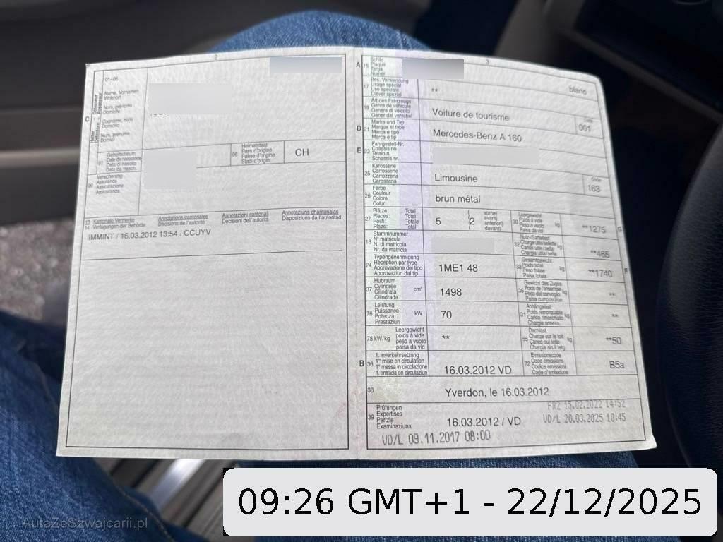 | Sonderausstattung | Design- und Ausstattungslinie ELEGANCE (Ausstiegsleuchten in den Türen, MB-Radio Audio 5 RDS mit CD-Player MP3, Aux-in Anschluss (im Handschuhfach), Polster:Polsterung Stoff/Ledernachbildung ARTICO, Armlehne vorne mit Ablagefach, Kühlergrill-Lamellen in Atlasgrau mit Chromleisten, Leichtmetallräder im 10-Doppelspeichen- Design, 16J, Seitenschwellerverkleidung in Wagen- farbe lackiert, Sitze: Kreuzstützen für Vordersitze verstellbar, Licht: Nebelscheinwerfer, Verchromtes Auspuffendrohr, Lenkrad, Schalthebelgriff und Handbremshebelgriff in Leder, Beifahrersitz höhenverstellbar, Gepäcknetz im Beifahrerfussraum, Holzapplikationen), Licht- und Sichtpaket (Beide Make up-Spiegel beleuchtet, Scheinwerferaufschaltung, Regensensor für Scheibenwischer vorne, Fussraumbeleuchtung vorne, Auffindbeleuchtung, Innenspiegel automatisch abblendbar), 7-Stufen-Automat CVT Autotronic inkl. Tempomat mit Speedtronic, Aussenspiegel rechts und links beheizt, elektrisch verstell- / und einklappbar, blendfrei, Räder: Notrad |