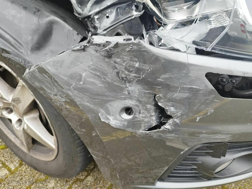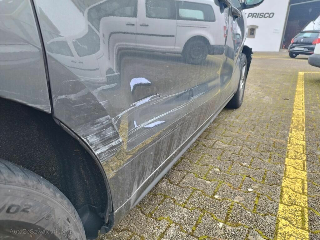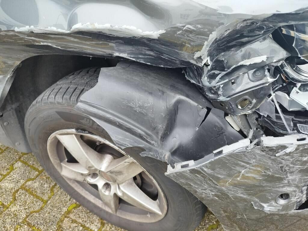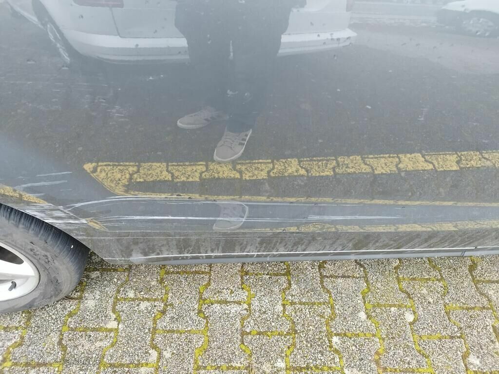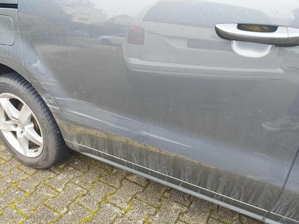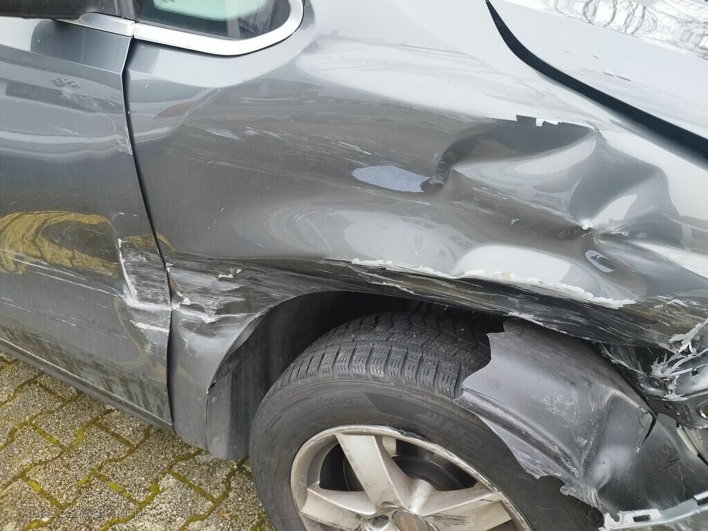 Die ganze rechte Seite hat Kratzspuren und ist deformiert, die Felge vorne rechts hat Kratzspuren, das Rad vorne rechts steht schräg, die Felge hinten rechts hat Kratzspuren.