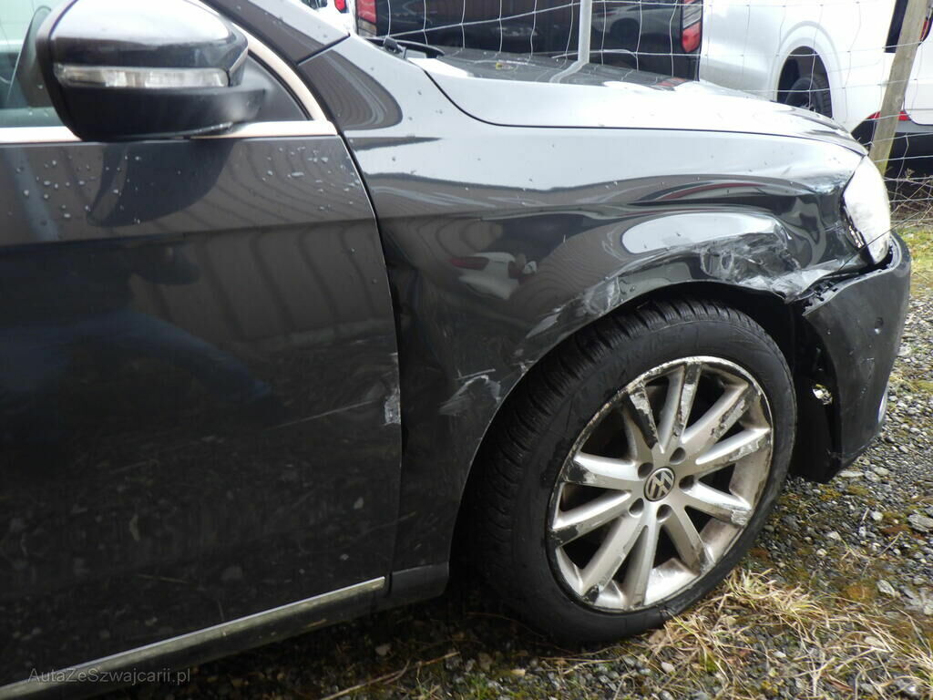 Choc avant et tout le flanc droit endommagé par un camion et la VW Passat a été poussée contre la bordure à gauche (pression sur les 2 jantes gauche + éventuellement suspensions gauche).