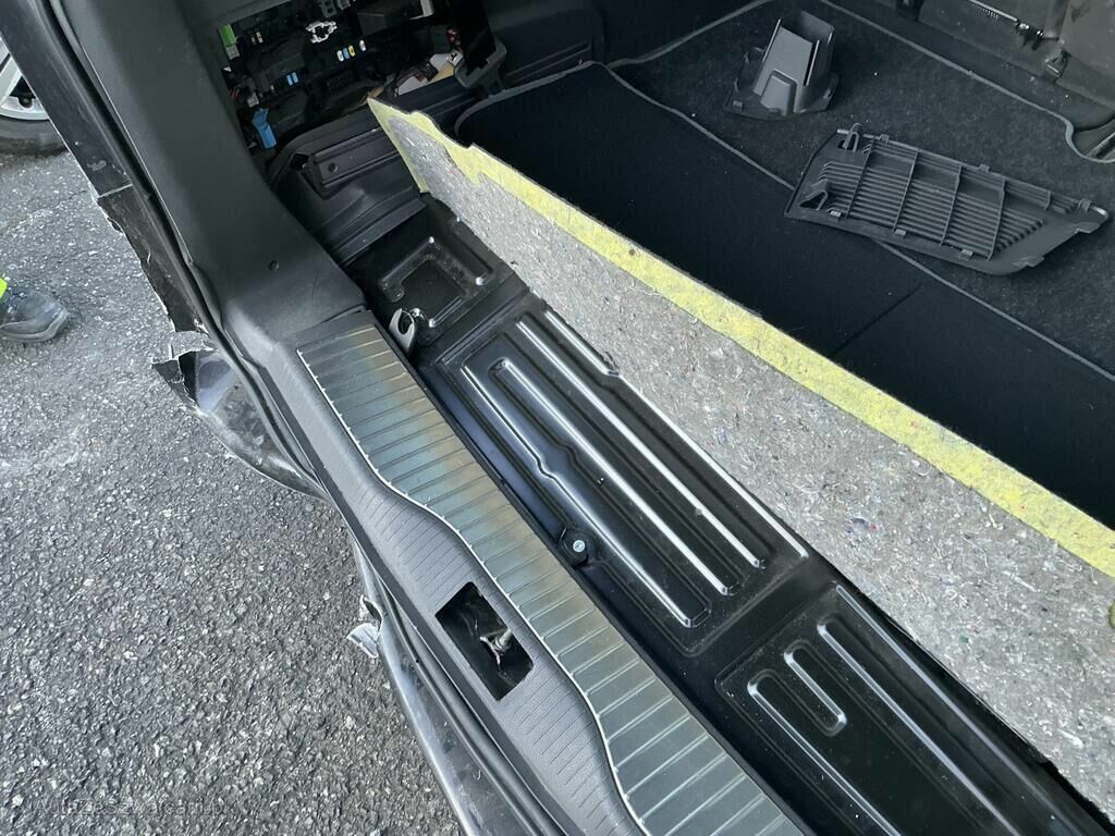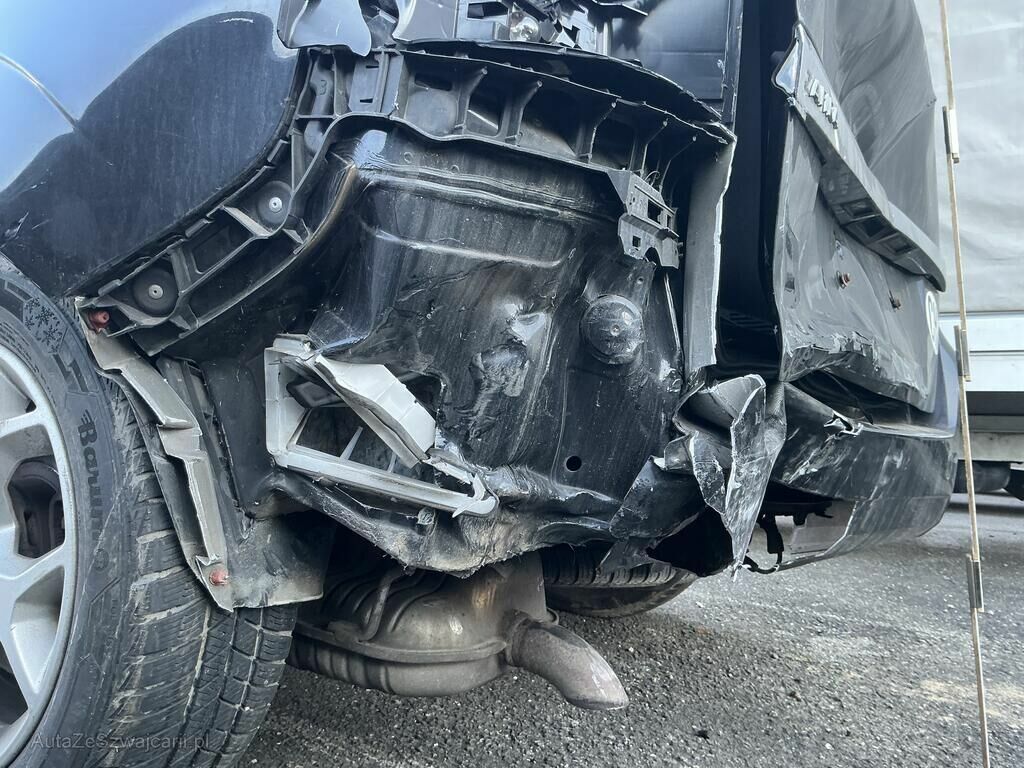 Tamponnement arrière gauche: pare-chocs, spoiler, hayon, revêtements intérieur, jupe, renforts, supports, échappement, porte-serrure arrière, aile, porte endommagés.